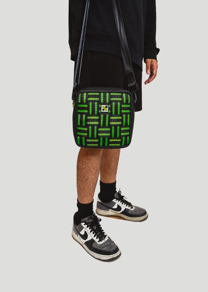 حقيبة الرافعة مصنوعة من أحزمة أمان مُعاد استخدامها حيث يتم نسج الأشرطة معًا لإنشاء تصميم قوي وعملي. والنتيجة هي حقيبة متينة وعملية وعصرية لا تقدم بيانًا فحسب، بل تساعد أيضًا في تقليل النفايات من خلال منح حياة ثانية للمواد التي كان من الممكن أن ينتهي بها الأمر في مكب النفايات.