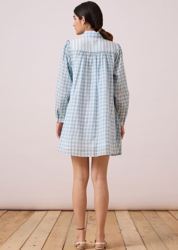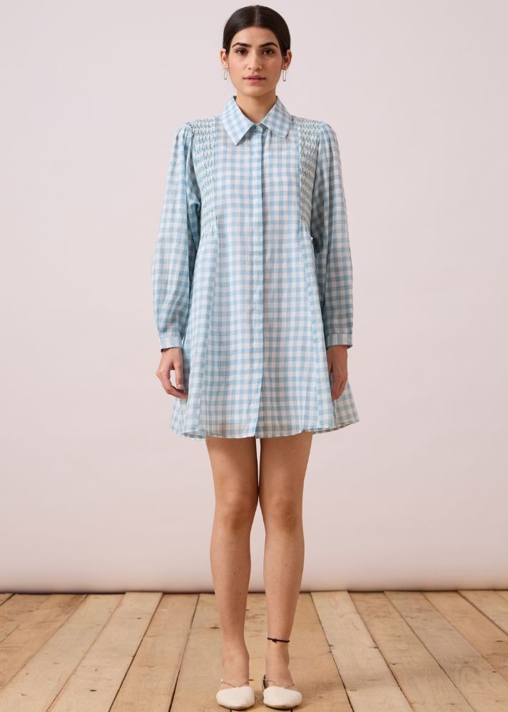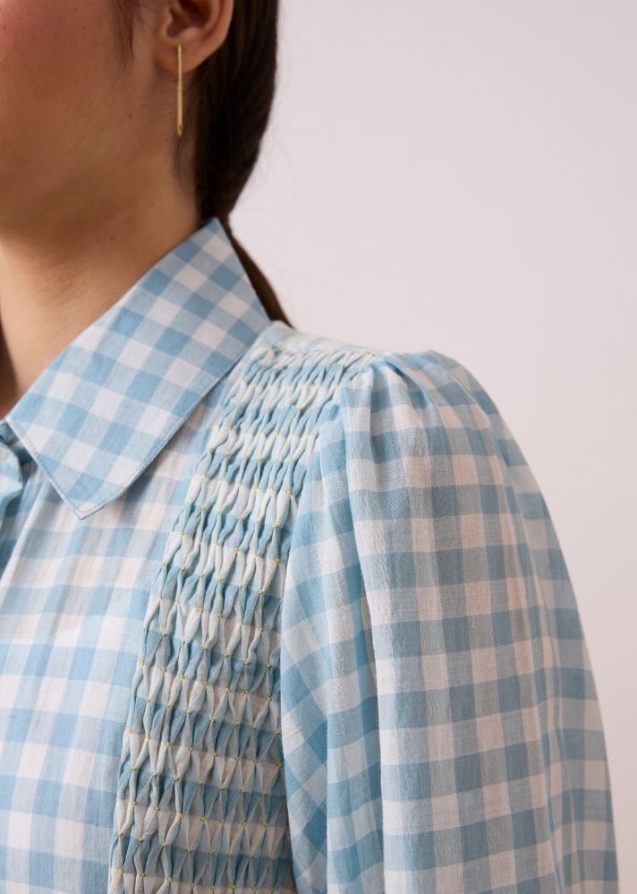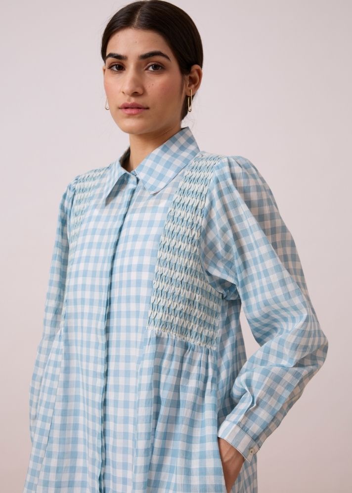 فستان قميص من القماش القطني الكلاسيكي. كم بطول ثلاثة أرباع ينتهي بأساور مجمعة. فتحة أمامية مخفية. يتميز بتفاصيل دخانية يدوية في الأمام.