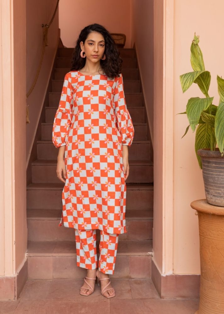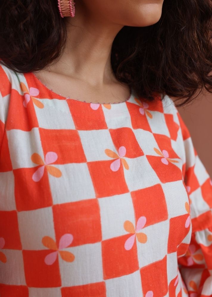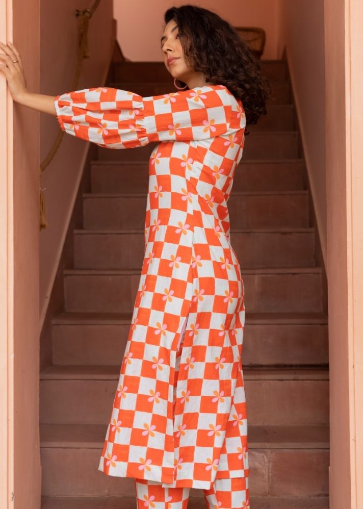 "نقدم لك كورتا بلوسوم الخاصة بنا بنقشة مربعات من القطن العضوي. مع خط عنق دائري كلاسيكي وأكمام بالونية جذابة، تجمع هذه الكورتا بسلاسة بين الراحة والرقي. مع تفاصيل الخرز الزجاجي حول الرقبة والأكمام تلتقط جوهر السحر البسيط والنعمة السهلة. تم تصنيع هذا المنتج بواسطة ارتيسان راهول"