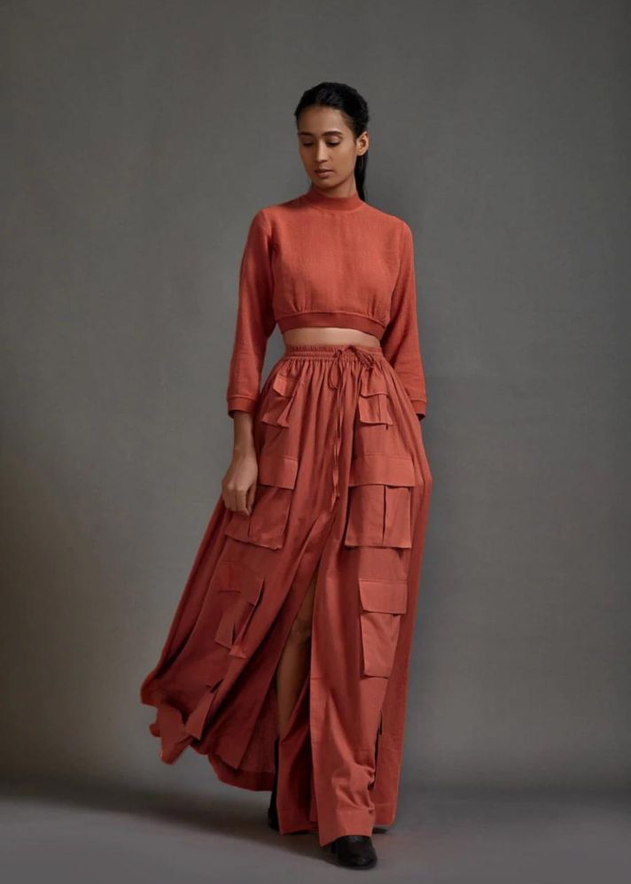 تنورة سفاري طويلة مع خصر مطاطي، وجيوب كارجو وفتحة في المنتصف.