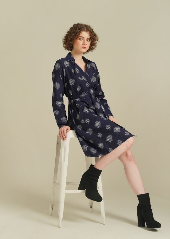 يتميز الفستان الكلاسيكي ذو الصدر المزدوج بتصميم على شكل حرف A، ويغلق من الأمام وياقة مدببة وجيوب مائلة.