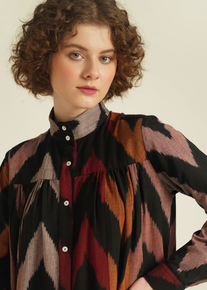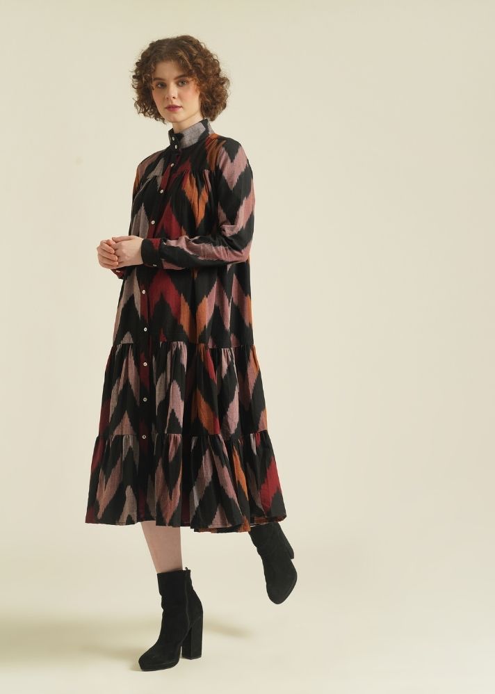 فستان قميصي ذو طبقات بسيط، يتميز بياقة عالية، وزر أمامي للغلق، وأكمام كاملة، ويأتي مع طيات لطيفة في الأمام والخلف يمكن تصميمها بطرق متعددة.