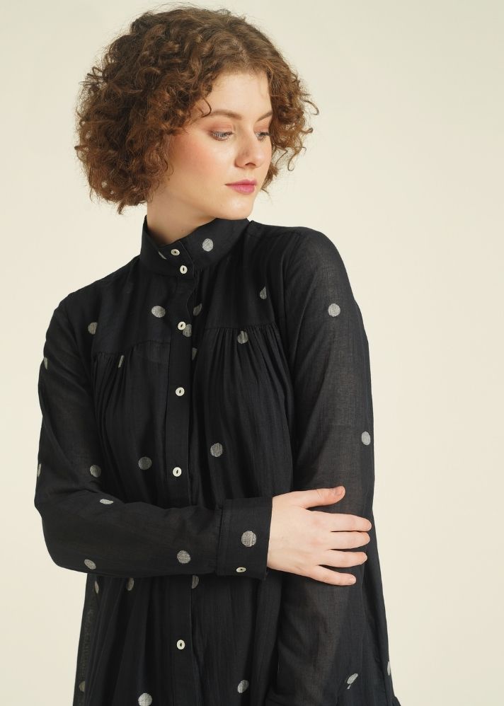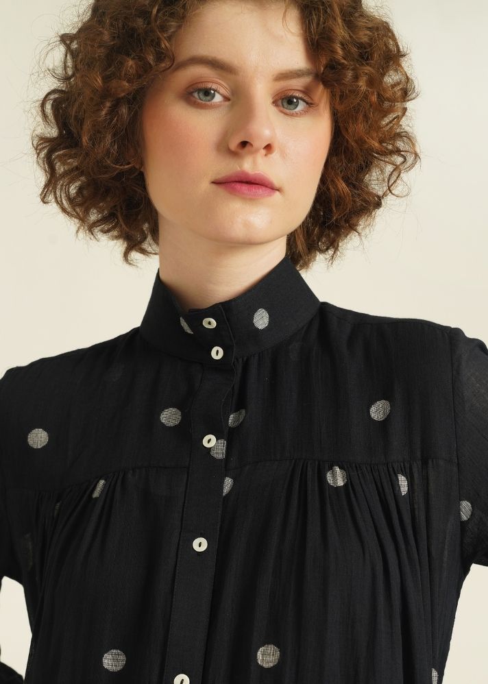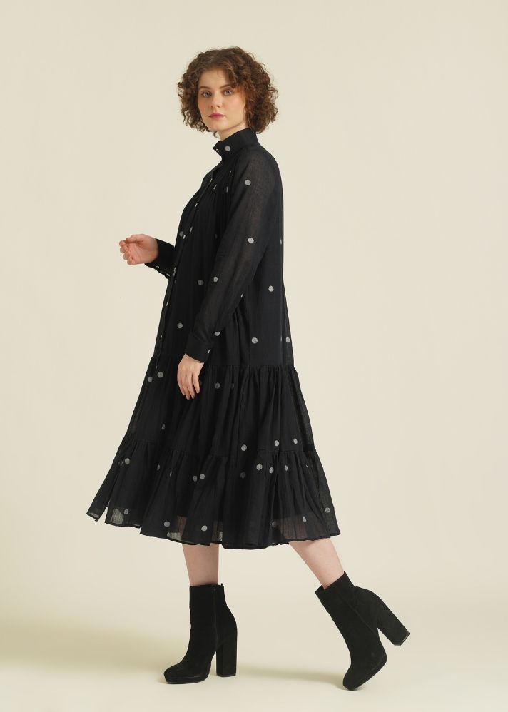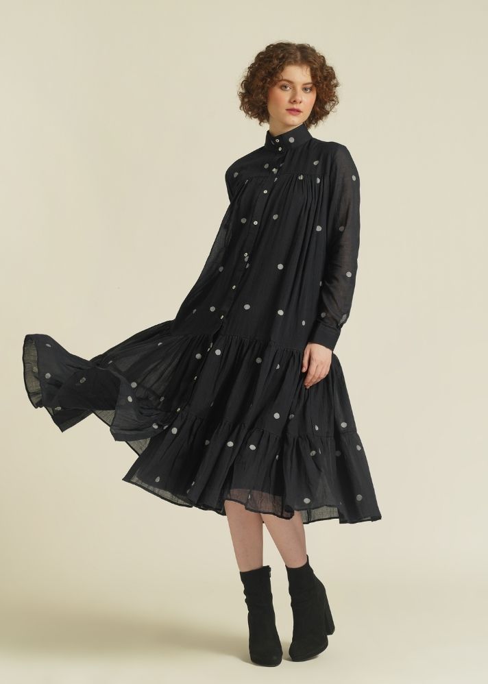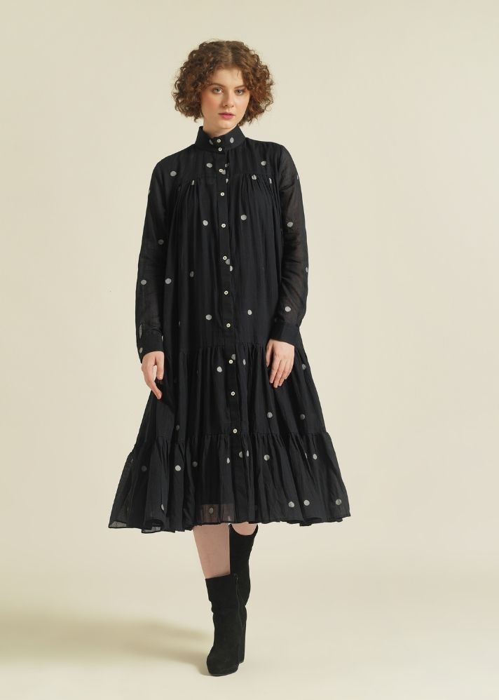 فستان قميصي ذو طبقات بسيط، يتميز بياقة عالية، وزر أمامي للغلق، وأكمام كاملة، ويأتي مع طيات لطيفة في الأمام والخلف يمكن تصميمها بطرق متعددة. يأتي هذا الفستان أيضًا مع زلة منفصلة.