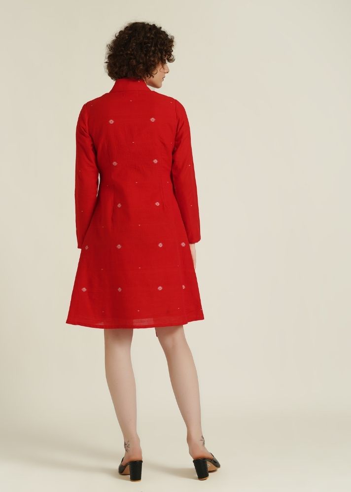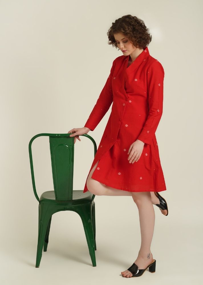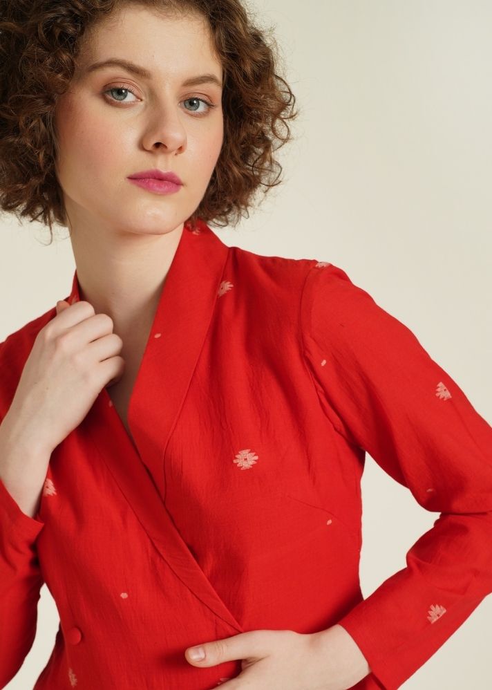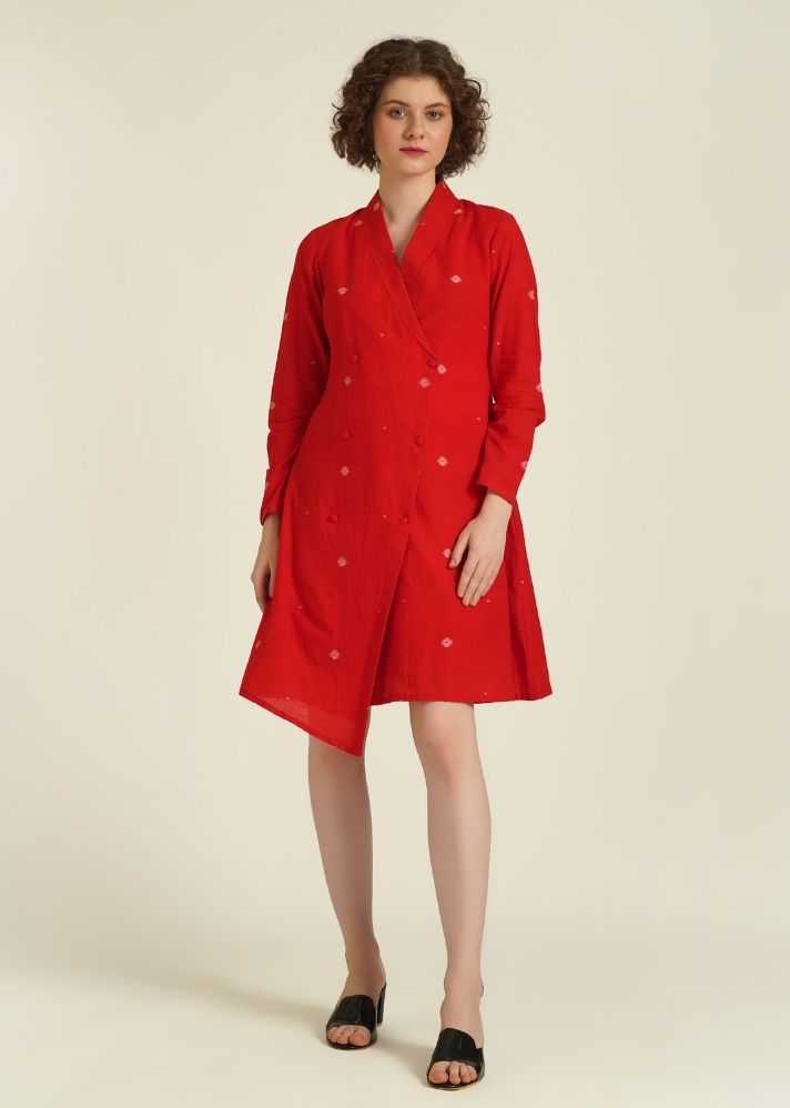 فستان سترة أحمر كلاسيكي يتميز بياقة شال وأكمام كاملة وأزرار مزدوجة الصدر وصورة ظلية غير متماثلة. تم نسج الفستان يدويًا على يد حرفيين هنود، كما يتميز ببطانة متصلة وجيوب جانبية.