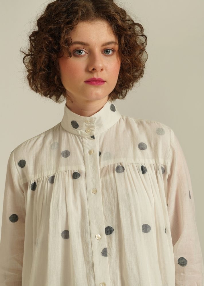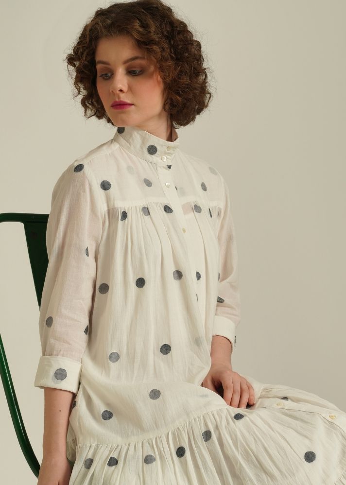 فستان قميصي ذو طبقات بسيط، يتميز بياقة عالية، وزر أمامي للغلق، وأكمام كاملة، ويأتي مع طيات لطيفة في الأمام والخلف يمكن تصميمها بطرق متعددة. يأتي هذا الفستان أيضًا مع قطعة منفصلة من القطن.