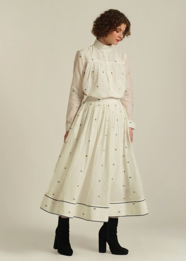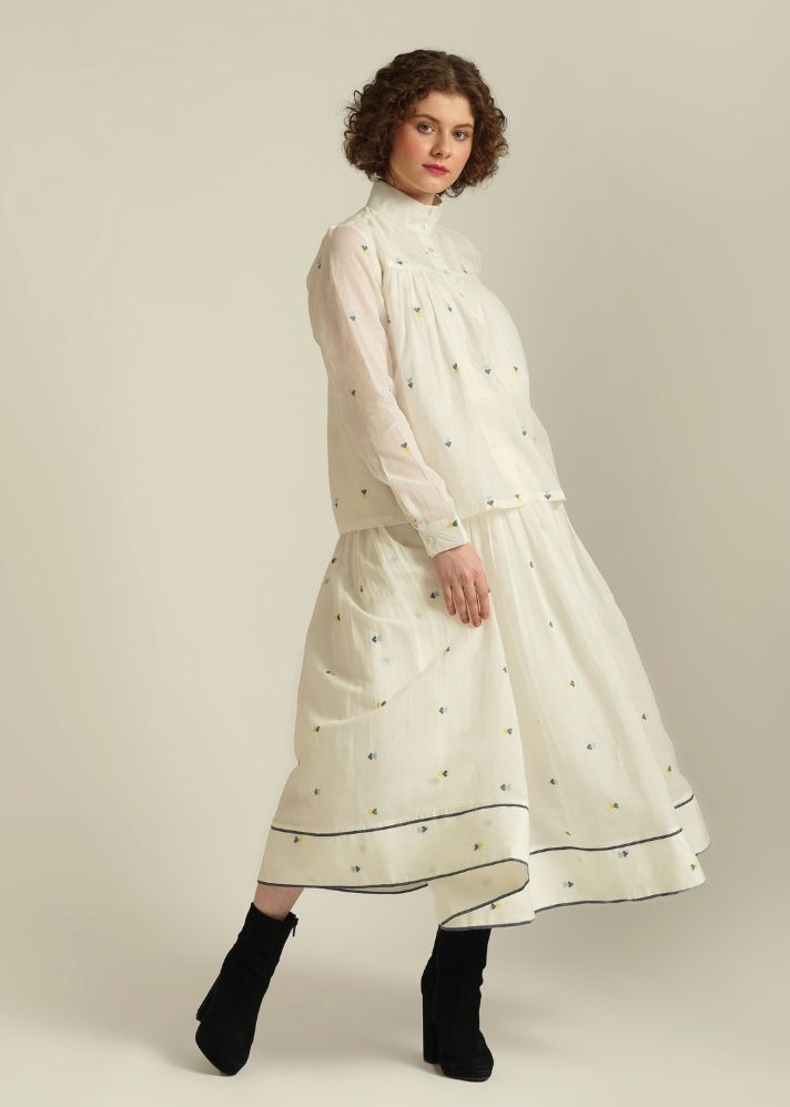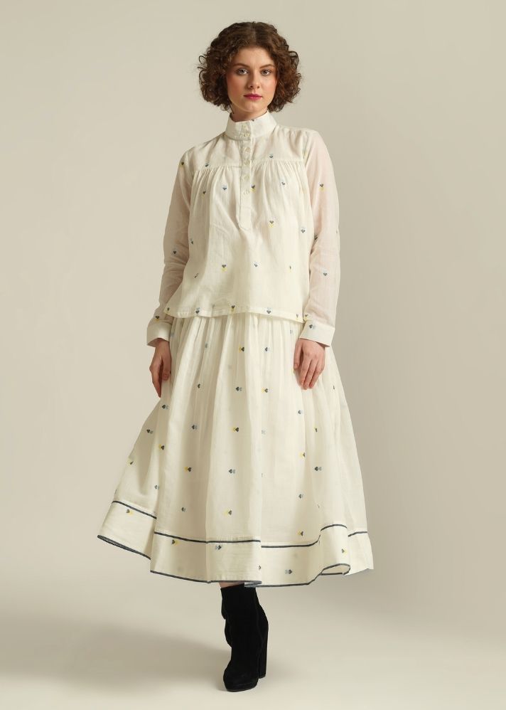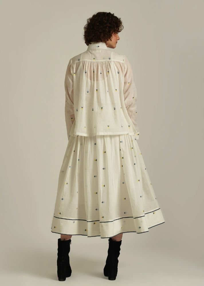 تتميز هذه المجموعة المصنوعة يدويًا بتنورة مجمعة مع تفاصيل حواف وجيوب جانبية وقمة ذات ياقة عالية متناسقة. تأتي هذه المجموعة أيضًا مع حزام قطني منفصل وحزام ربط قابل للإزالة للتصفيف.