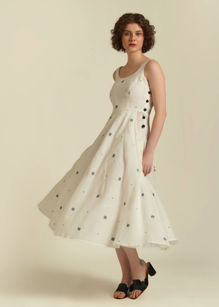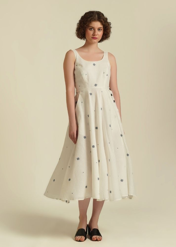 يتميز الفستان الكلاسيكي ذو المقاس المناسب والواسع بصدرية ملائمة، وتنورة نصف دائرية، وزر جانبي للإغلاق، ويأتي مع جيوب جانبية مخيطة.