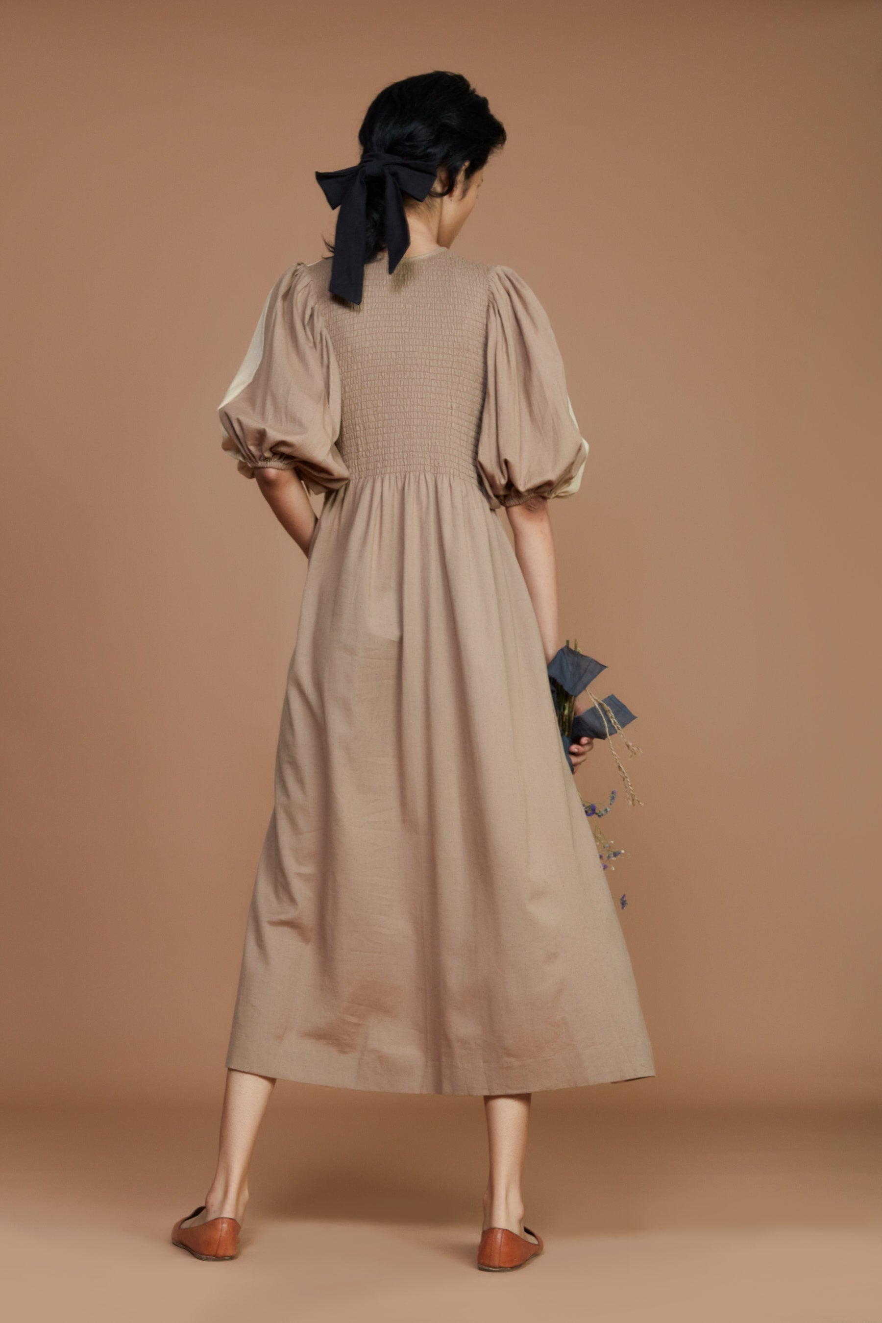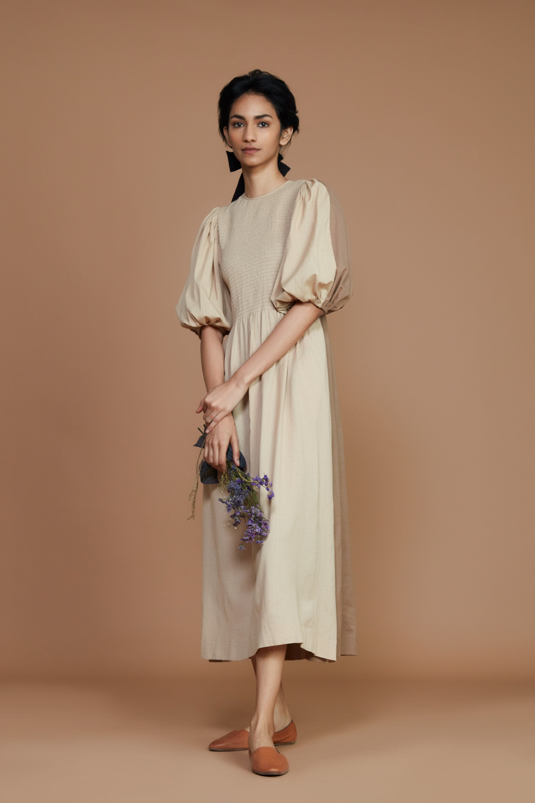 فستان بأكمام واسعة قابل للقلب بلون بيج وعاجي