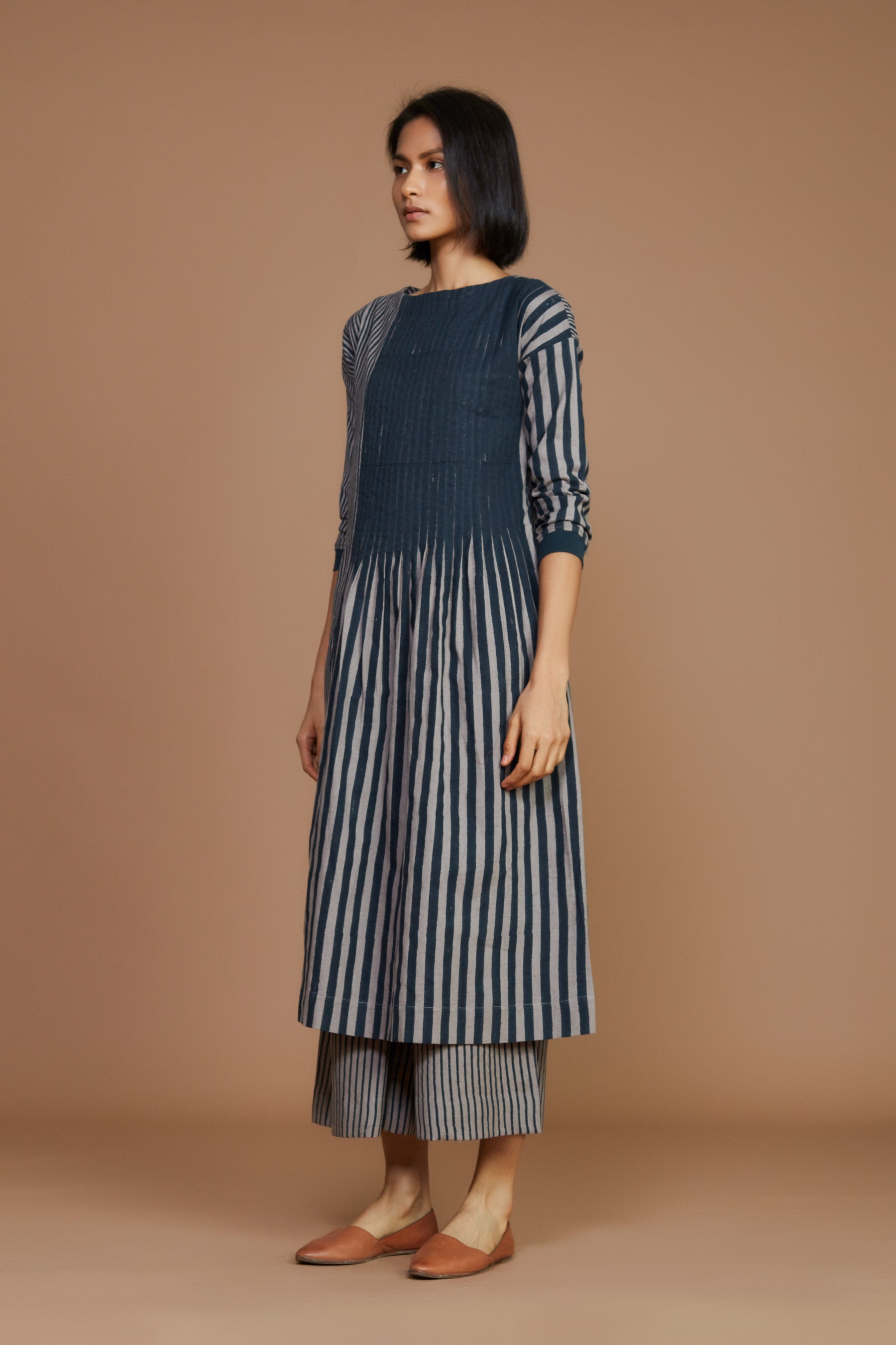 فستان بثنيات مخطط بلون رمادي وفحمي