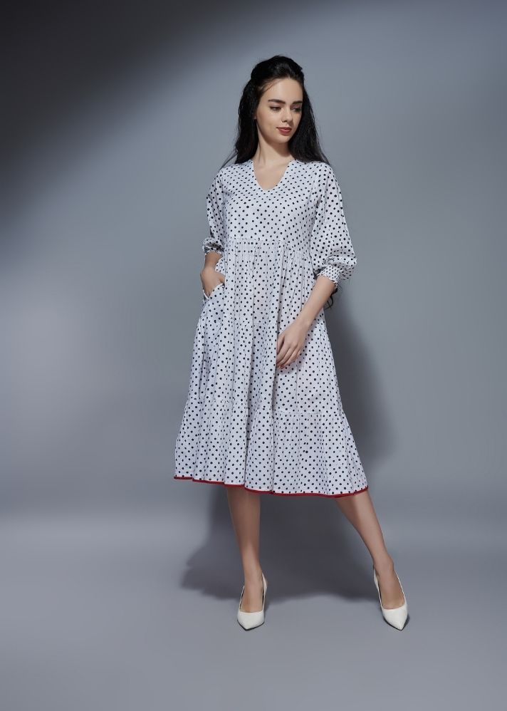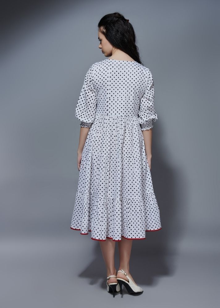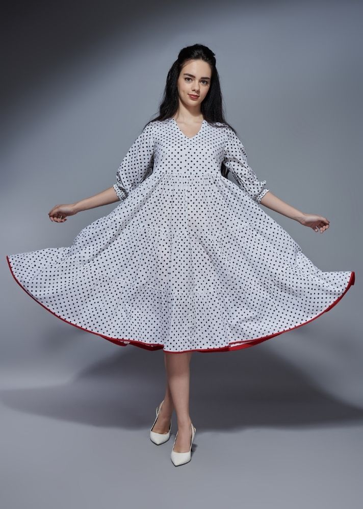 فستان بنقشة ريترو مرقطة - أبيض
