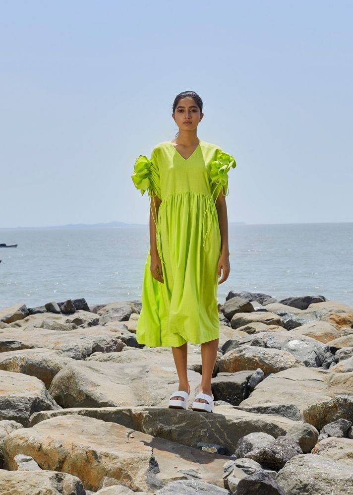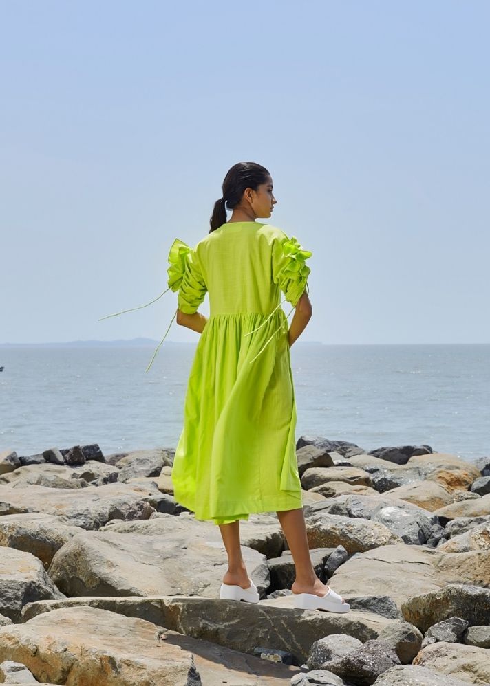 فستان رافل اخضر فاقع بكم