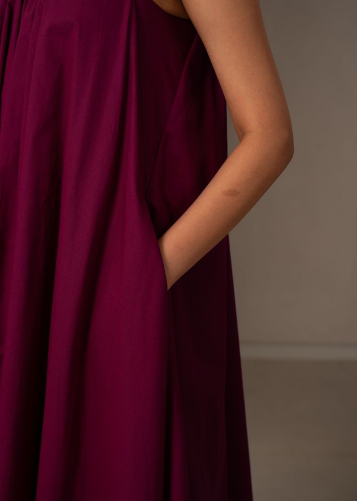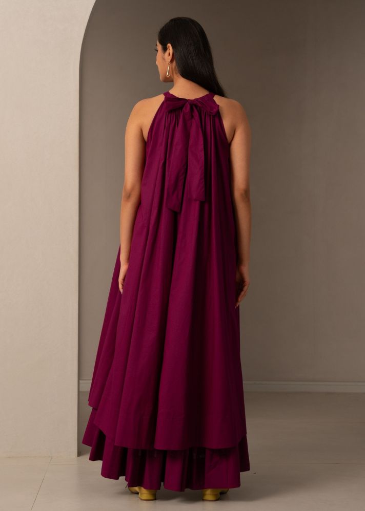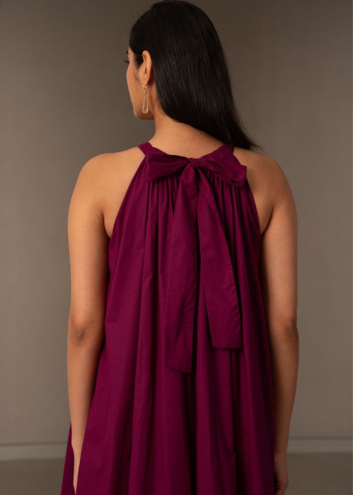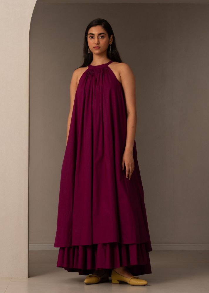 فستان ماكسي دقيق للغجر في المناطق الحضرية. أكمام تكشف الكتف وتنتهي بقوس في الخلف. تجمعات ناعمة عند الرقبة.