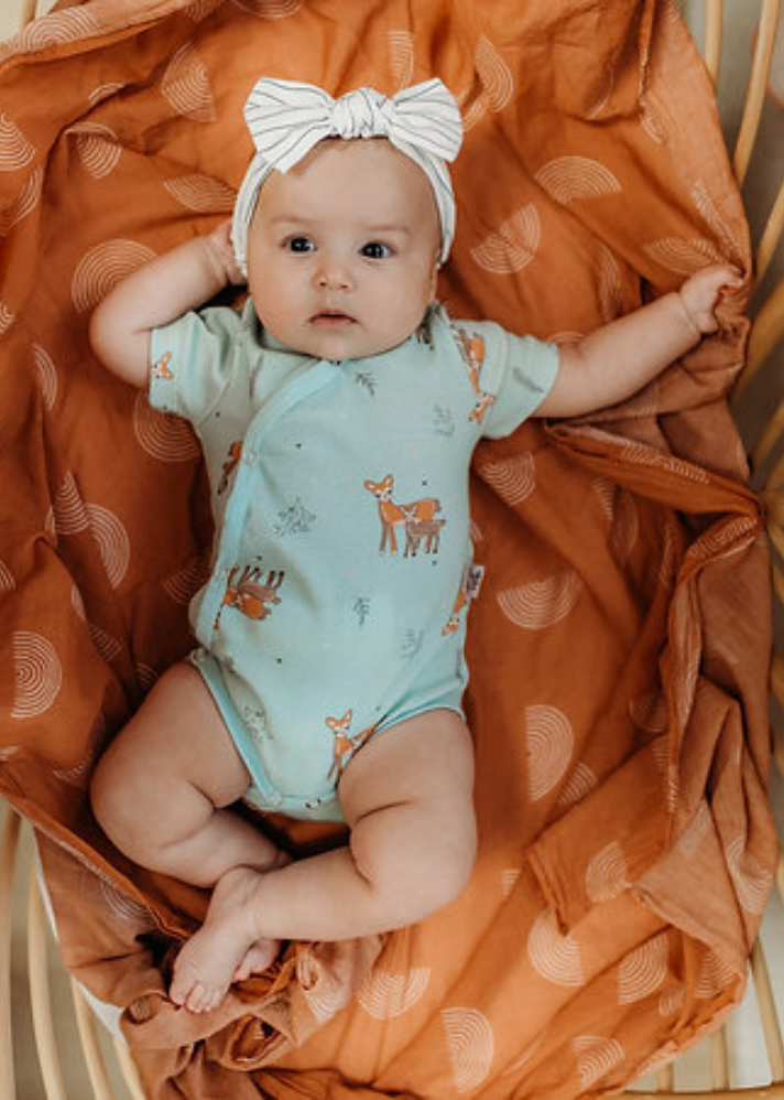 إن ألبستنا فائقة النعومة مصنوعة من القطن العضوي بنسبة 100% المصبوغ بشكل طبيعي على طراز الكيمونو الملتف. وتسهل الأزرار المفاجئة ارتدائها مع أطفالنا الصغار، كما أنها خالية من التوتر بالنسبة لنا نحن الآباء عندما يتعلق الأمر بإلباس أطفالنا الصغار الملابس الأساسية . بدءاً من المقاسات حديثي الولادة حتى عمر عام واحد، قمنا بتصميمها بكل حب واهتمام بالتفاصيل.