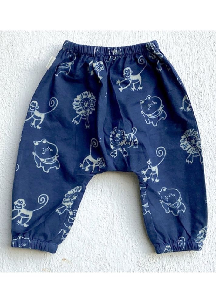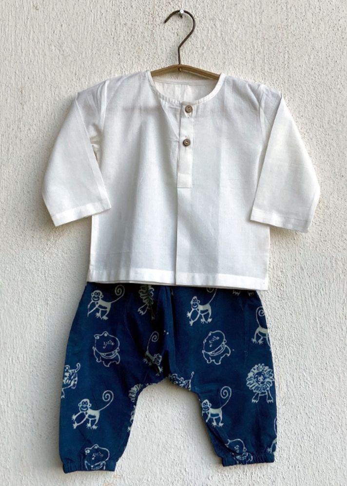 قرطق باللون الأبيض وبنطال باللون النيلي بطبعة الحيوانات من القطن العضوي ملائم للجنسين