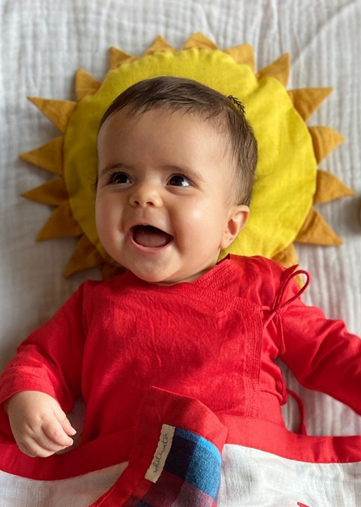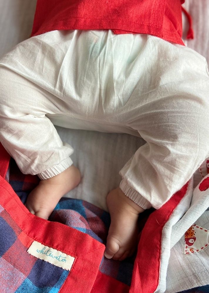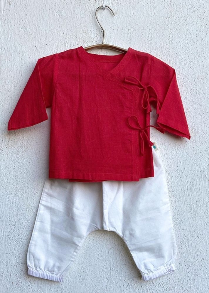 قطعة فوقية بأكمام باللون الأحمر وبنطال باللون الأبيض من القطن العضوي ملائم للجنسين