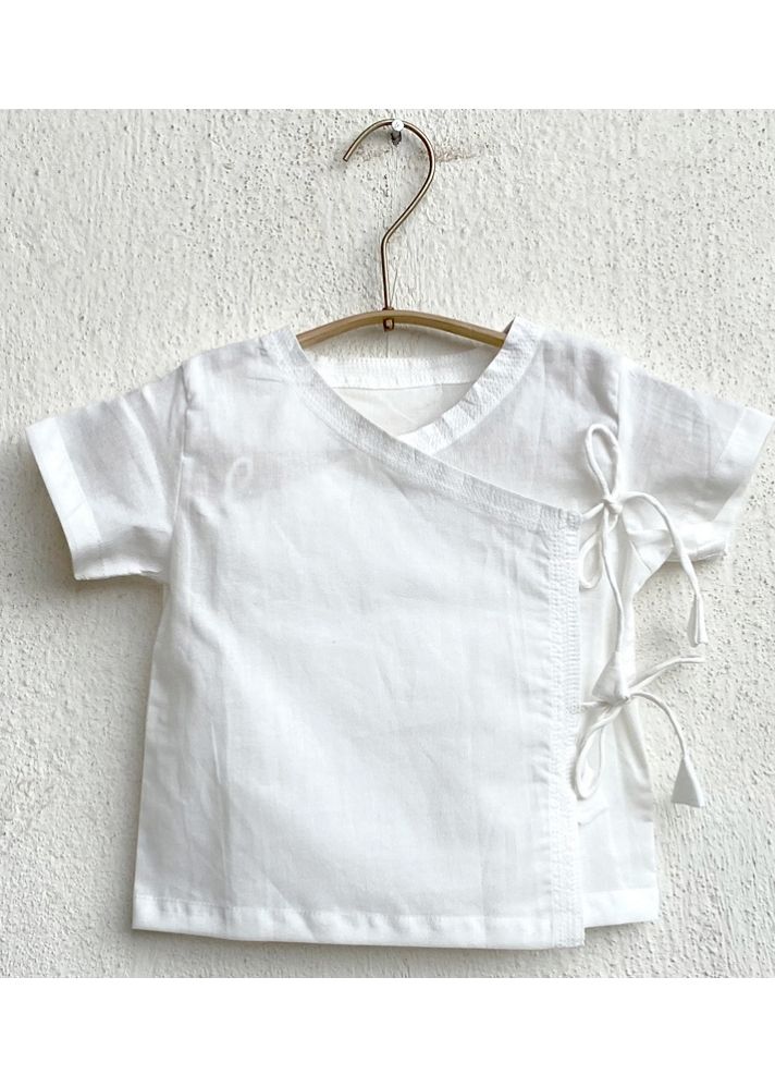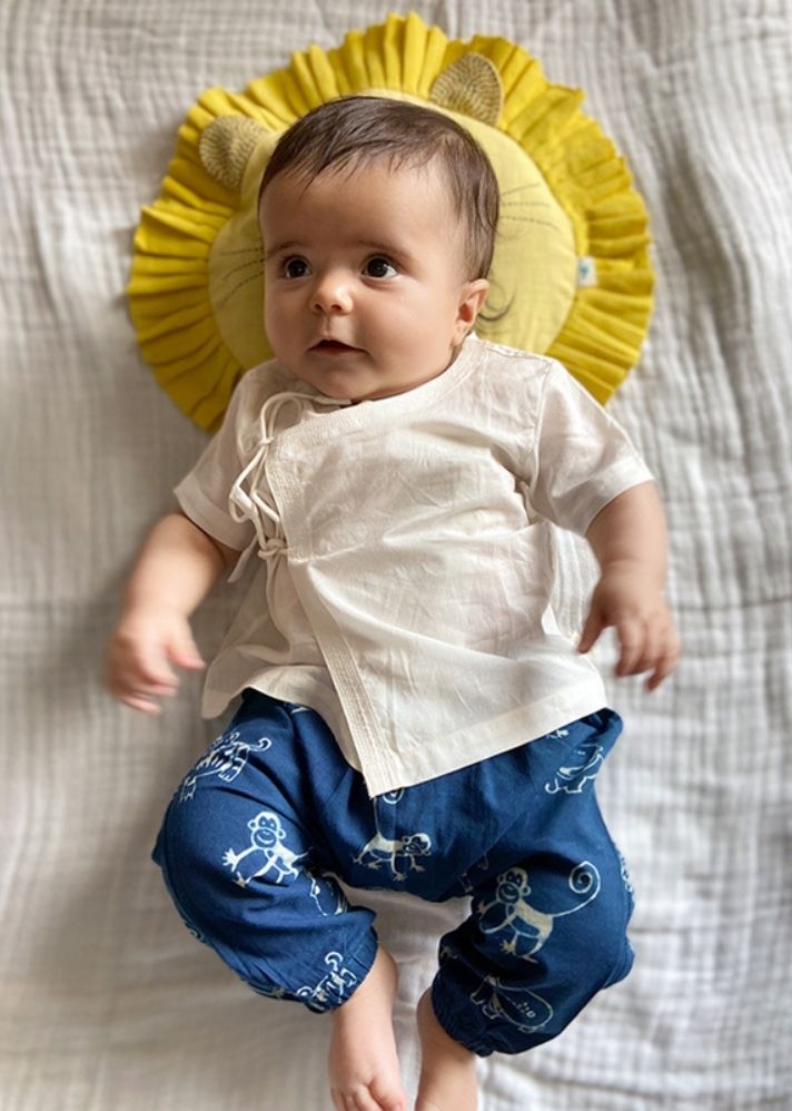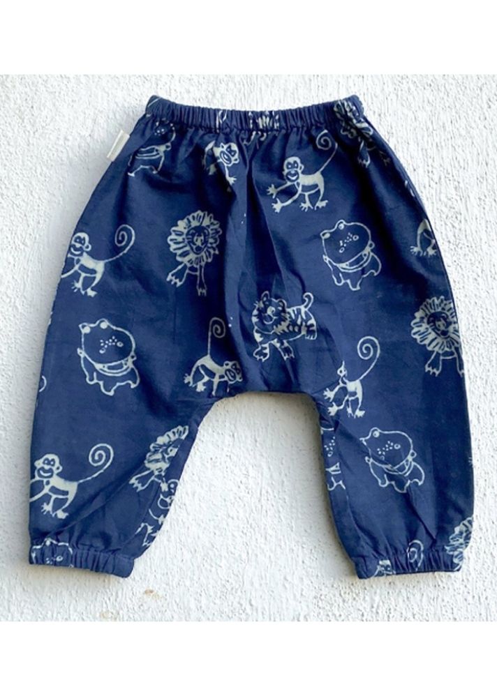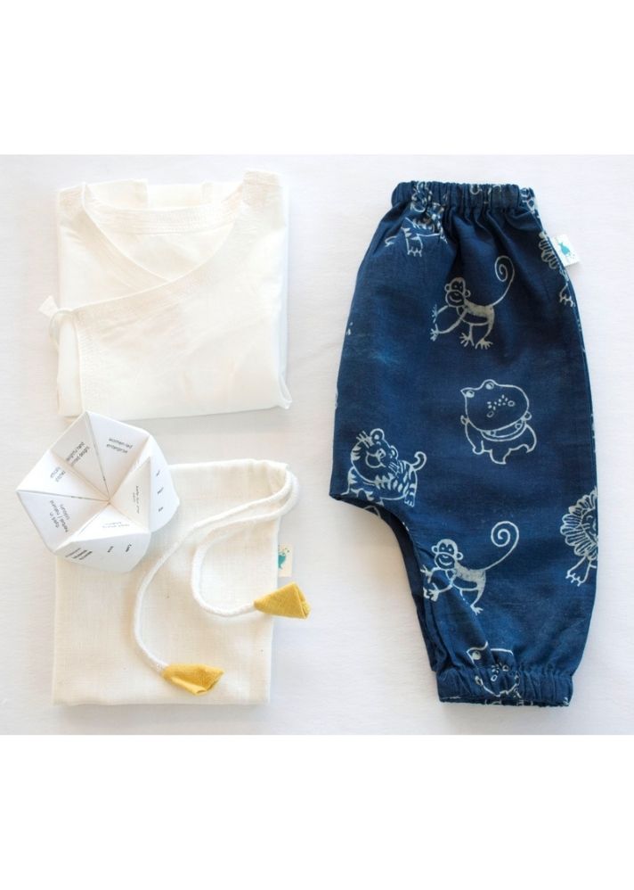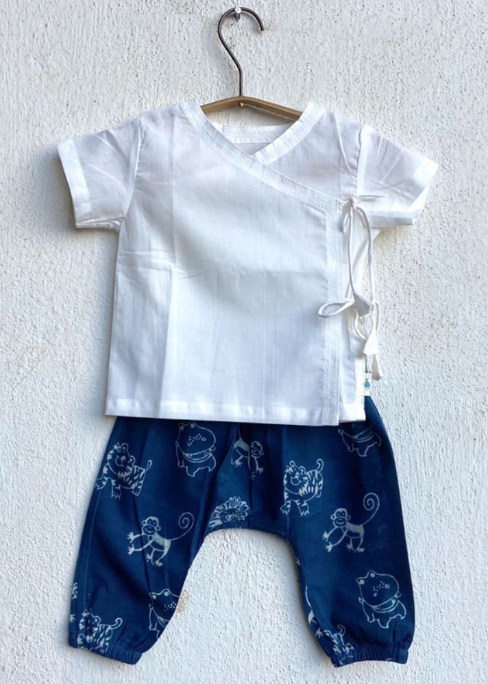 قطعة فوقية بأكمام قصيرة باللون الأبيض وبنطال باللون النيلي بطبعة الحيوانات من القطن العضوي ملائم للجنسين