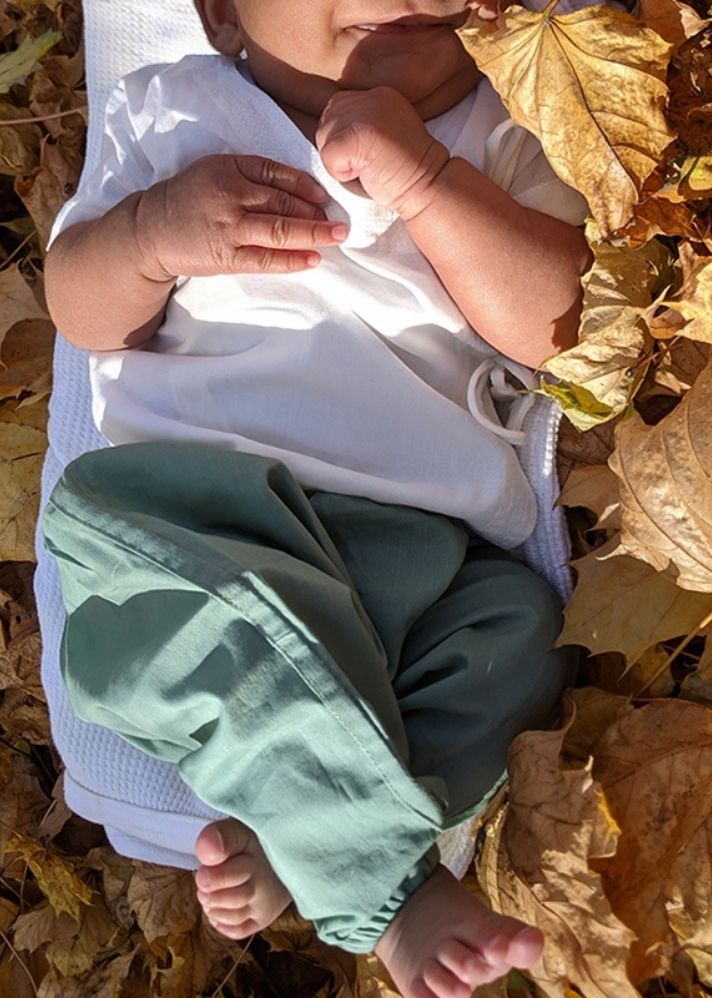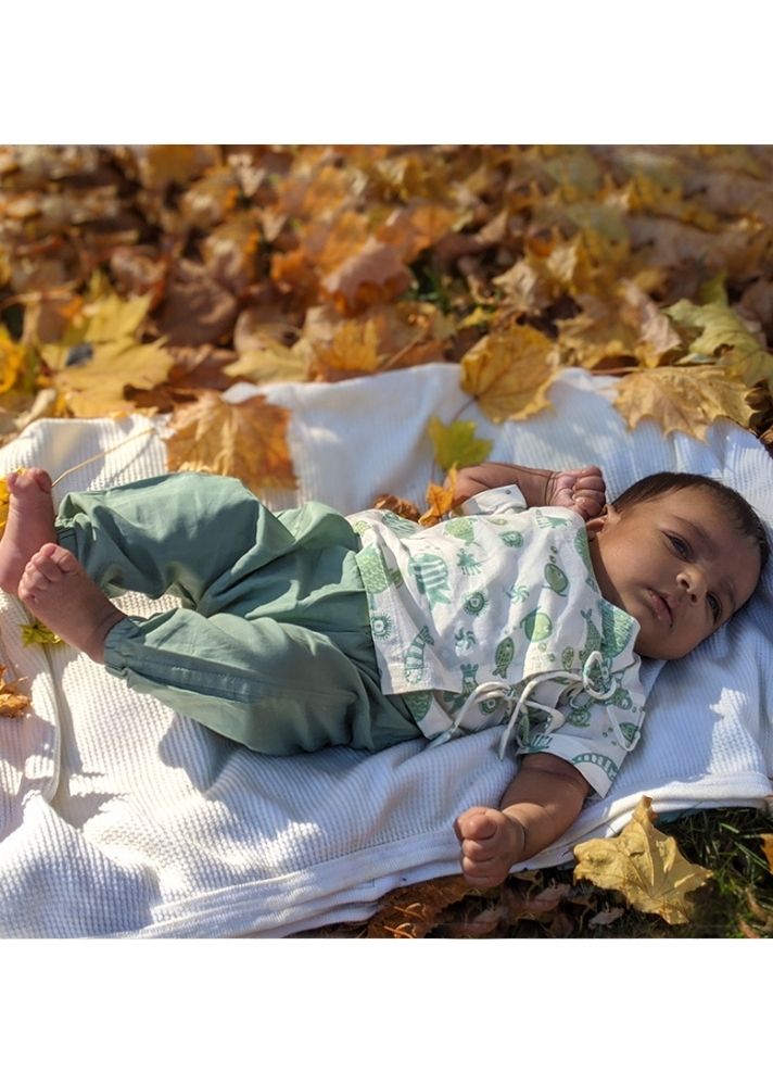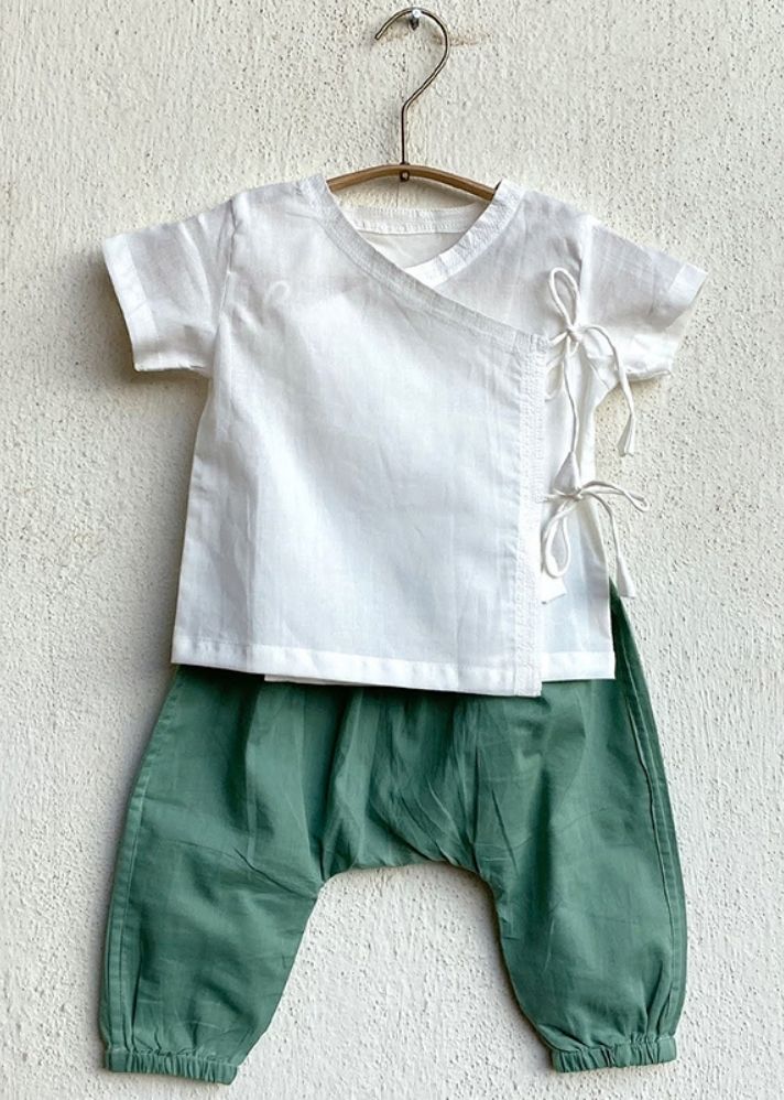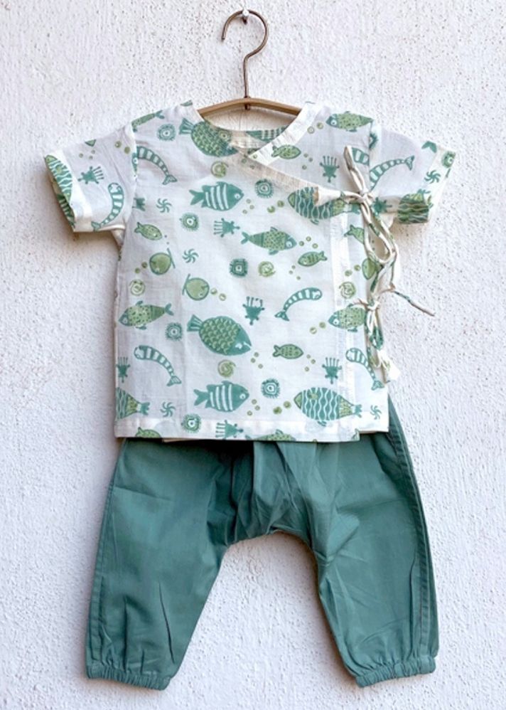 مجموعة كوي من القطن العضوي ملائمة للجنسين - قطعة فوقية بأكمام قصيرة باللون الأبيض والأخضر النعناعي وبنطال باللون الأخضر النعناعي من كوي