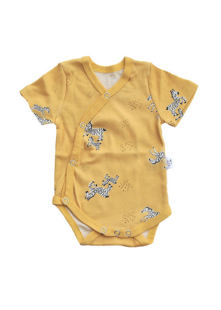 A Model Wearing Yellow Organic Cotton Zoe Organic Kimono Style Bodysuit , curated by Only Ethikal