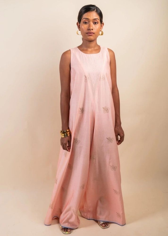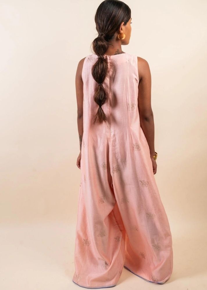 هذه البذلة بدون أكمام المصنوعة من القطن والحرير هي درس في الأناقة والأناقة. إنه ذو أرجل واسعة مع تفاصيل آلية على شكل حرف V أسفل خط العنق، وسحاب خلفي مخفي. تم تشطيب الحاشية بأنابيب زرقاء متباينة.