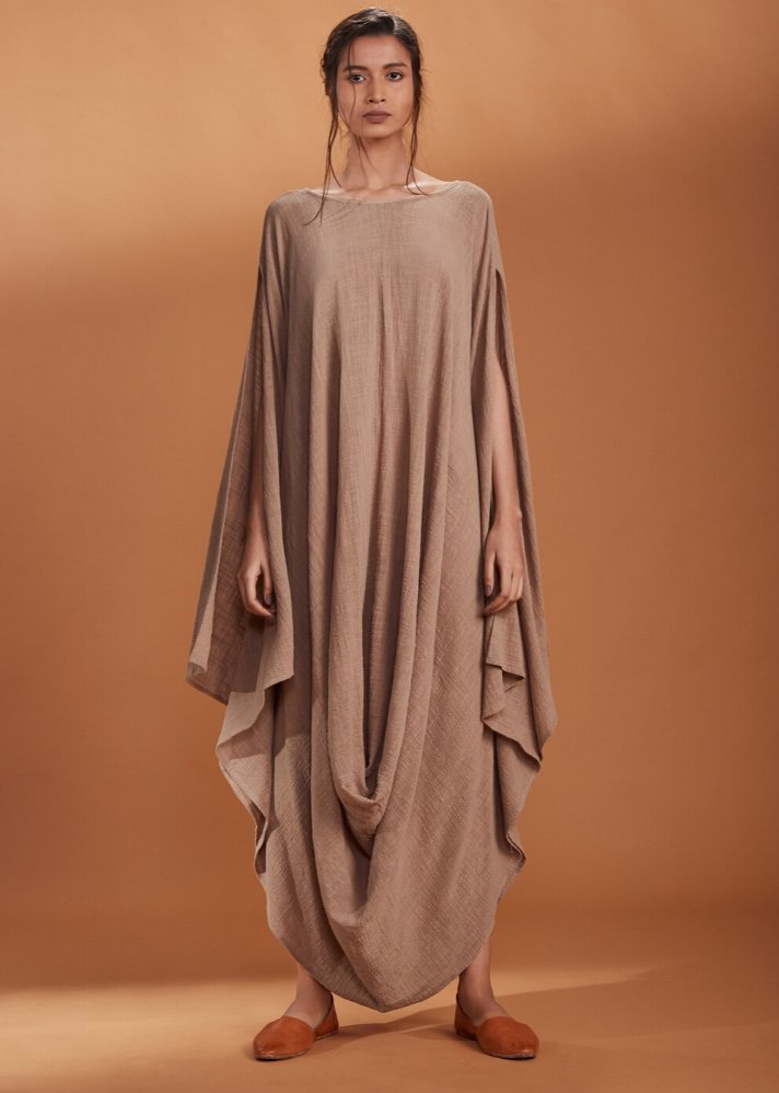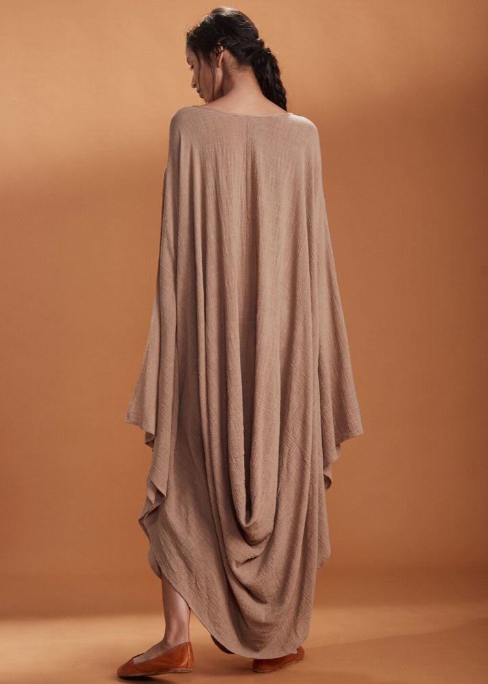 فستان طويل جميل على شكل قلنسوة بأكمام طويلة وقصة سهلة مع بطانة تكمل المظهر.