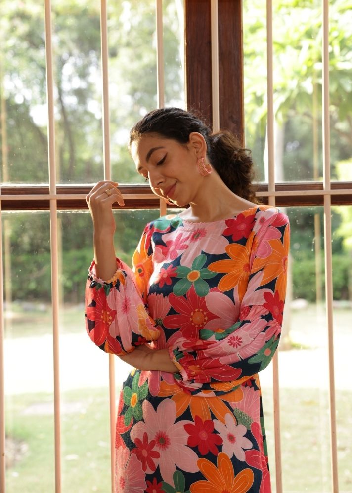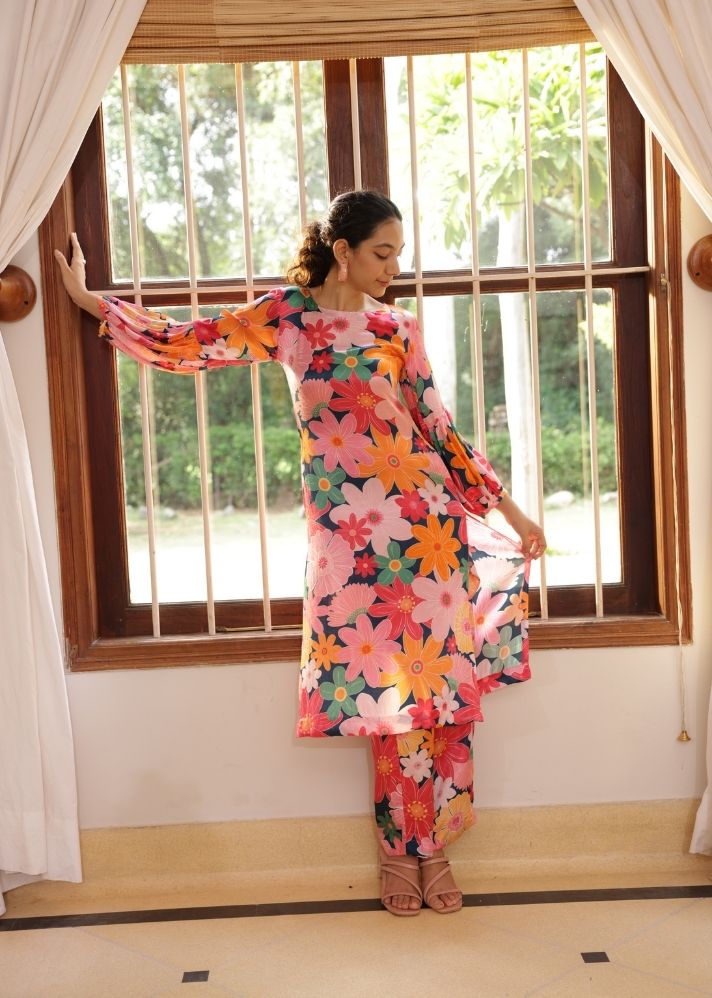 "طقم كورتا بلوم الخاص بنا من MOSAIC PINK BEMBERG SILK هو مزيج من كورتا بلوسوم وبنطلون إيريس، وهو مجموعة متناغمة تجمع بين الراحة والأناقة. تضفي خط العنق الدائري الكلاسيكي والأكمام البالونية للكورتا الأناقة، بينما توفر المجموعة مظهرًا منسقًا ومصقولًا. تم تصنيع هذا المنتج بواسطة ارتيسان راهول"