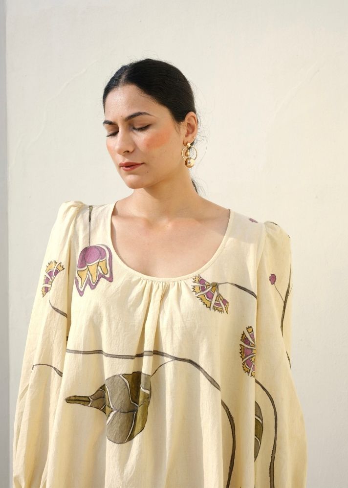 من المؤكد أنك ستشعرين بالجمال والراحة مع قميصنا متوسط الطول ذو الأكمام المنتفخة المريحة مع خط عنق مجمع وأكمام مكشكشة.