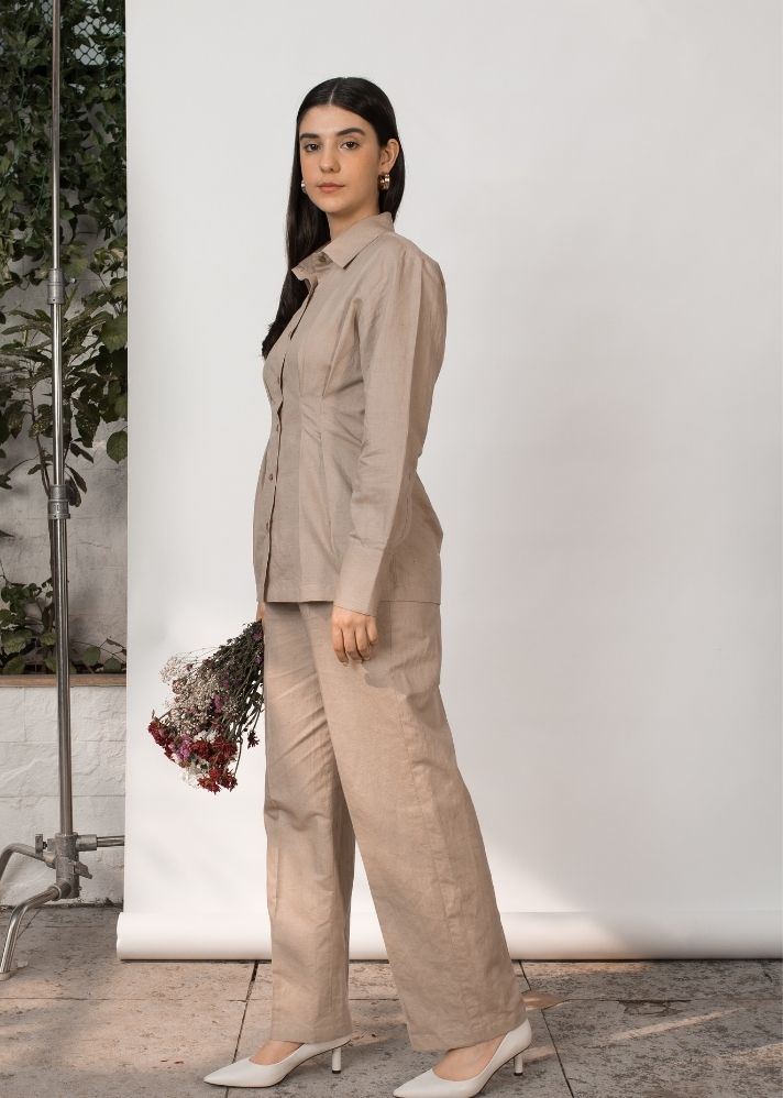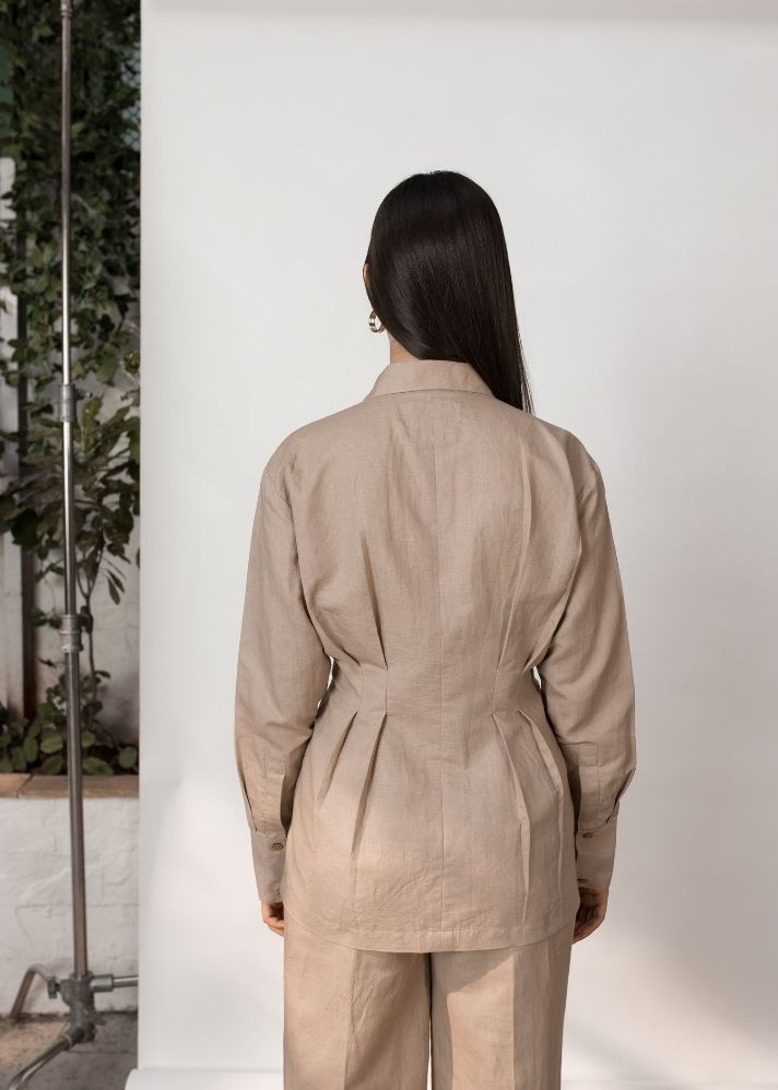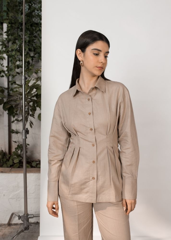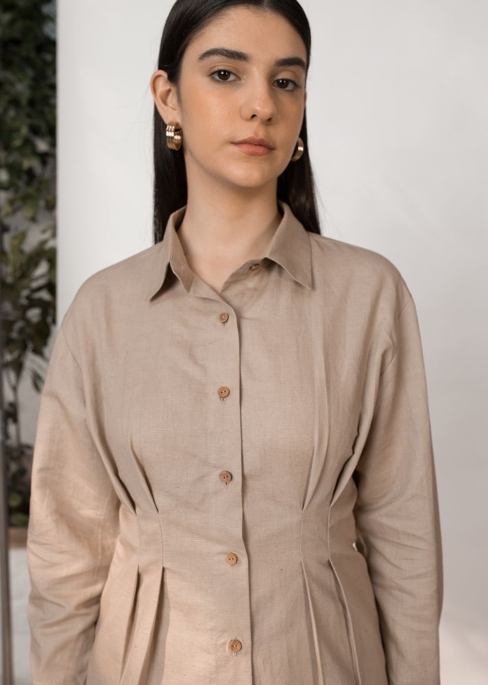 هذا القميص هو قطعة أساسية متعددة الاستخدامات، وراقية بأناقة الملابس. وهو مصمم بطيات في الأمام والخلف لتضييق الخصر. يكتمل بياقة حادة، وأساور أكمام كبيرة، وفتحة عادية بأزرار سفلية، وحاشية منحنية بمهارة.
