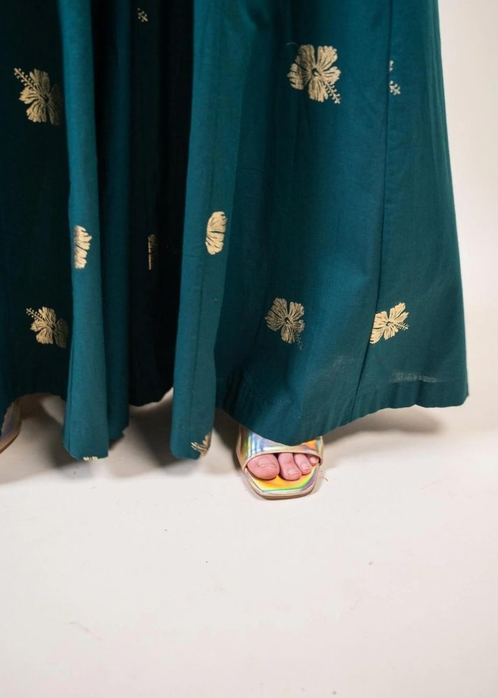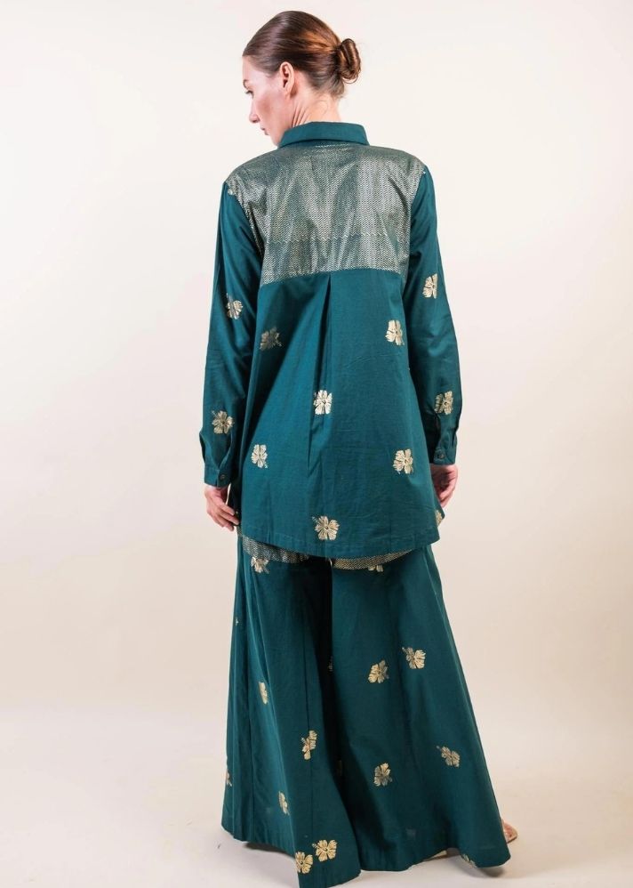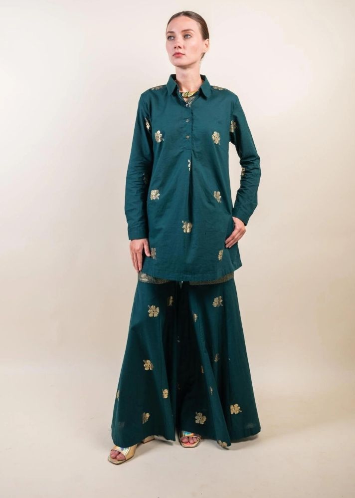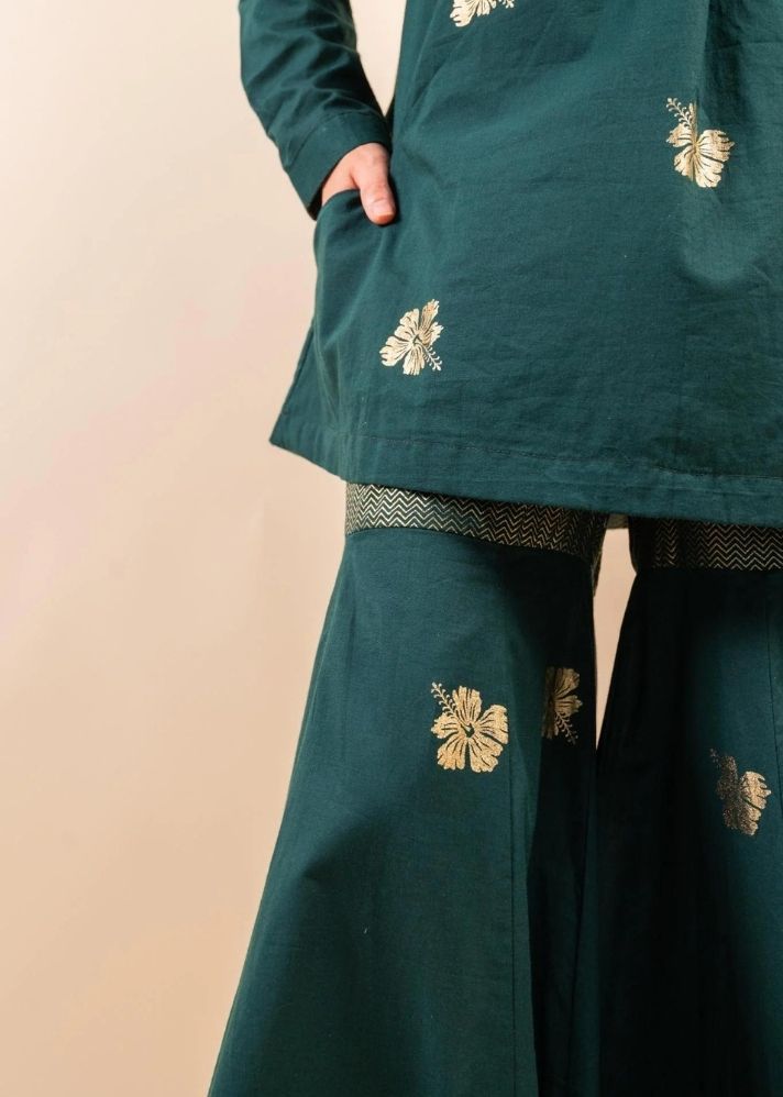 نظرة حديثة على الشرارة الأساسية. هذا التونيك القصير باللونين الإنجليزي والأخضر مع ياقة وخط شرارة على شكل حرف A مزين بطباعة رقائق ذهبية.