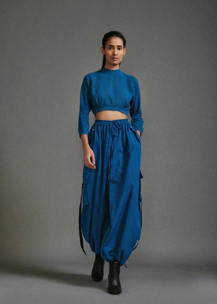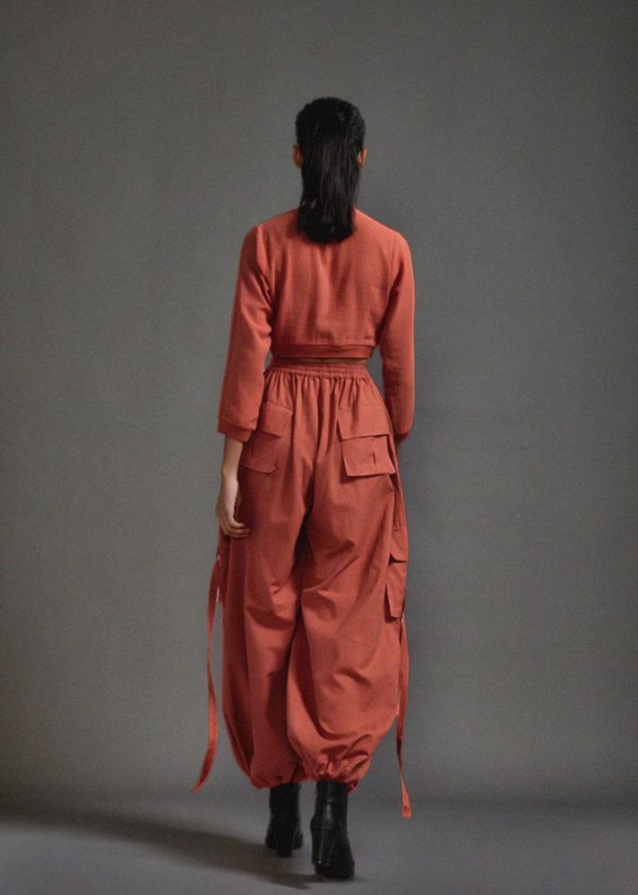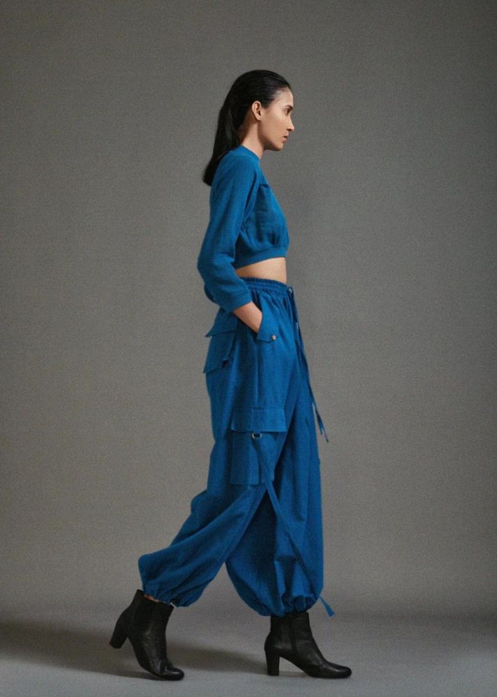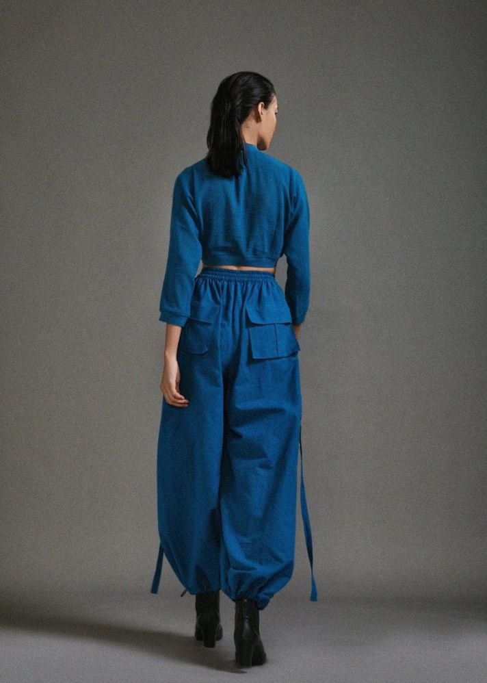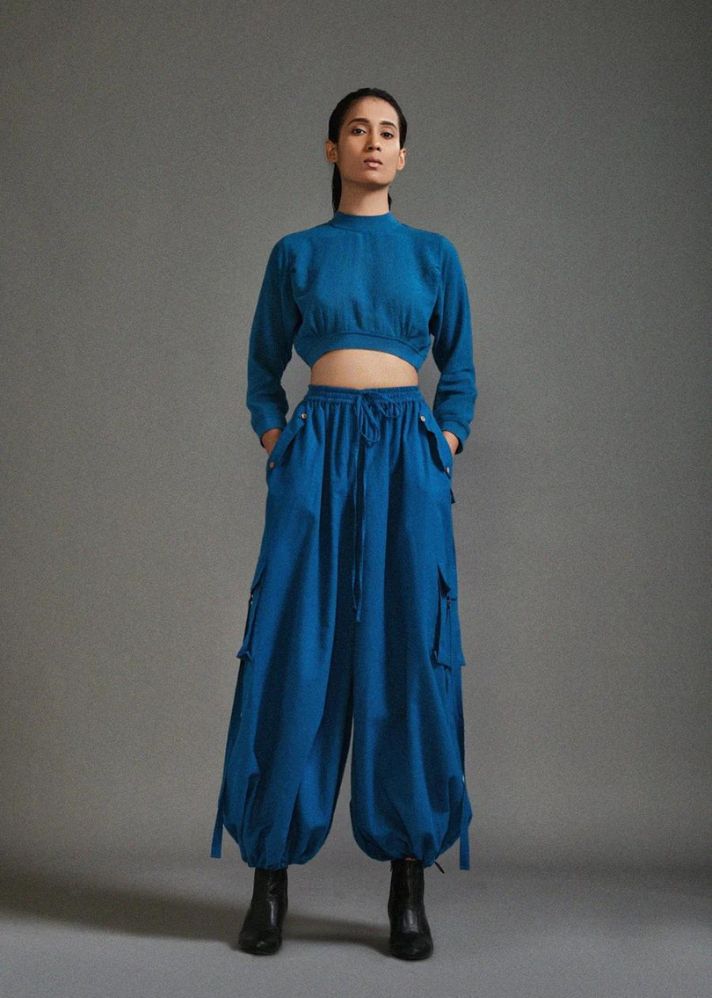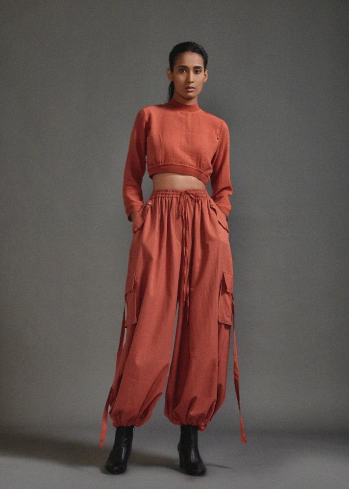 بلوزة قصيرة من القطن المزخرف مع خصر مضلع وخط عنق وحاشية للأكمام مع بنطال فضفاض بقصة ضيقة مع تفاصيل حزام على الجيوب وخصر مطاطي وحاشية.