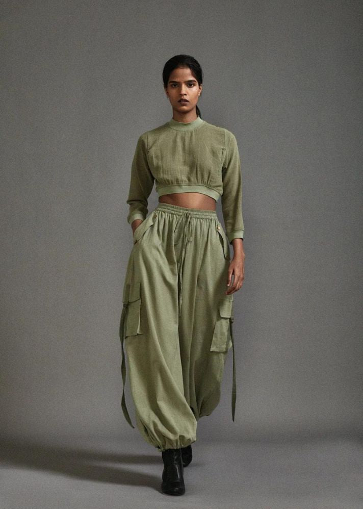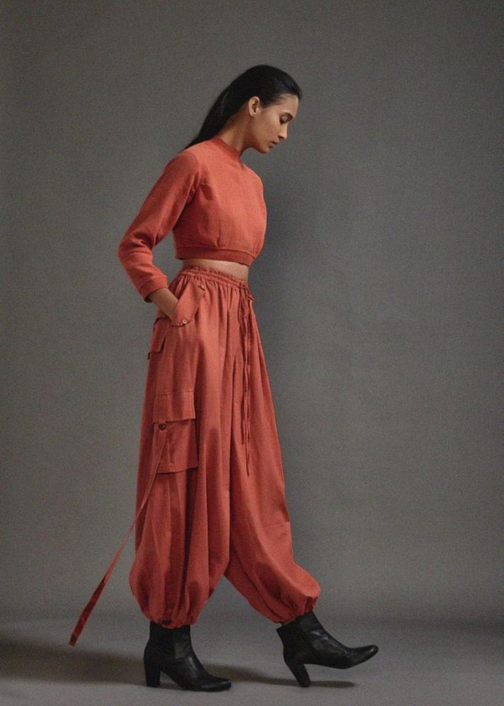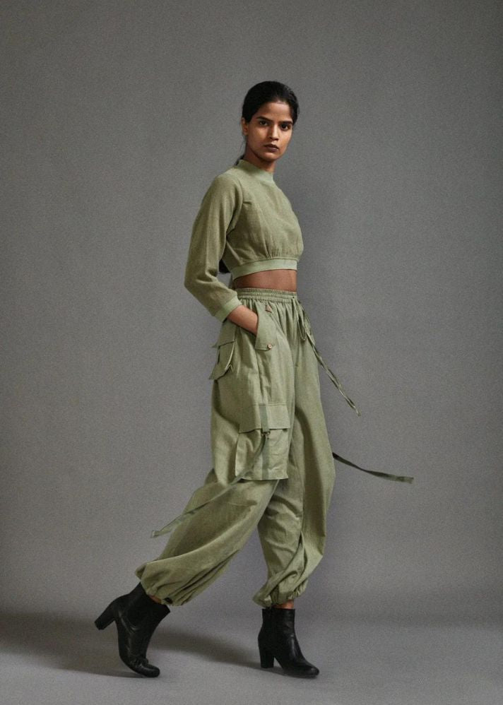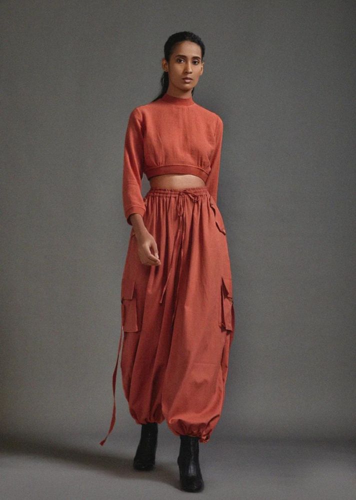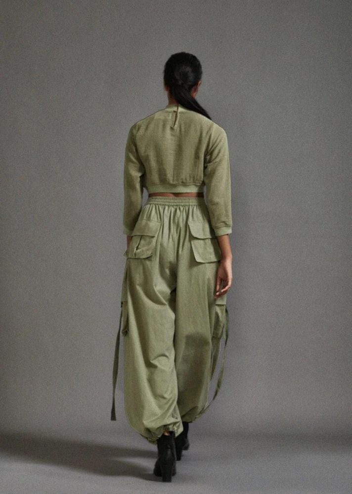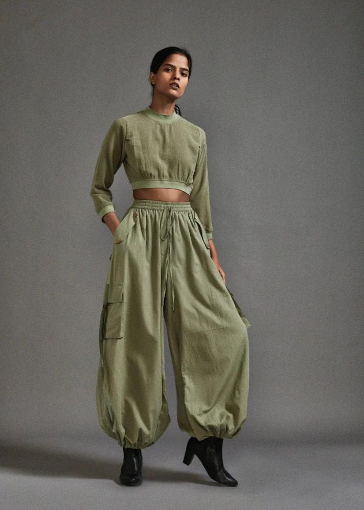 بلوزة قصيرة من القطن المزخرف مع خصر مضلع وخط عنق وحاشية للأكمام مع بنطال فضفاض بقصة ضيقة مع تفاصيل حزام على الجيوب وخصر مطاطي وحاشية.