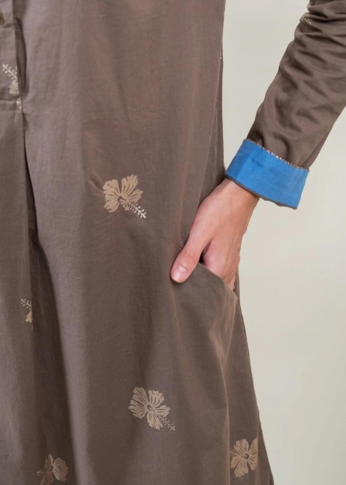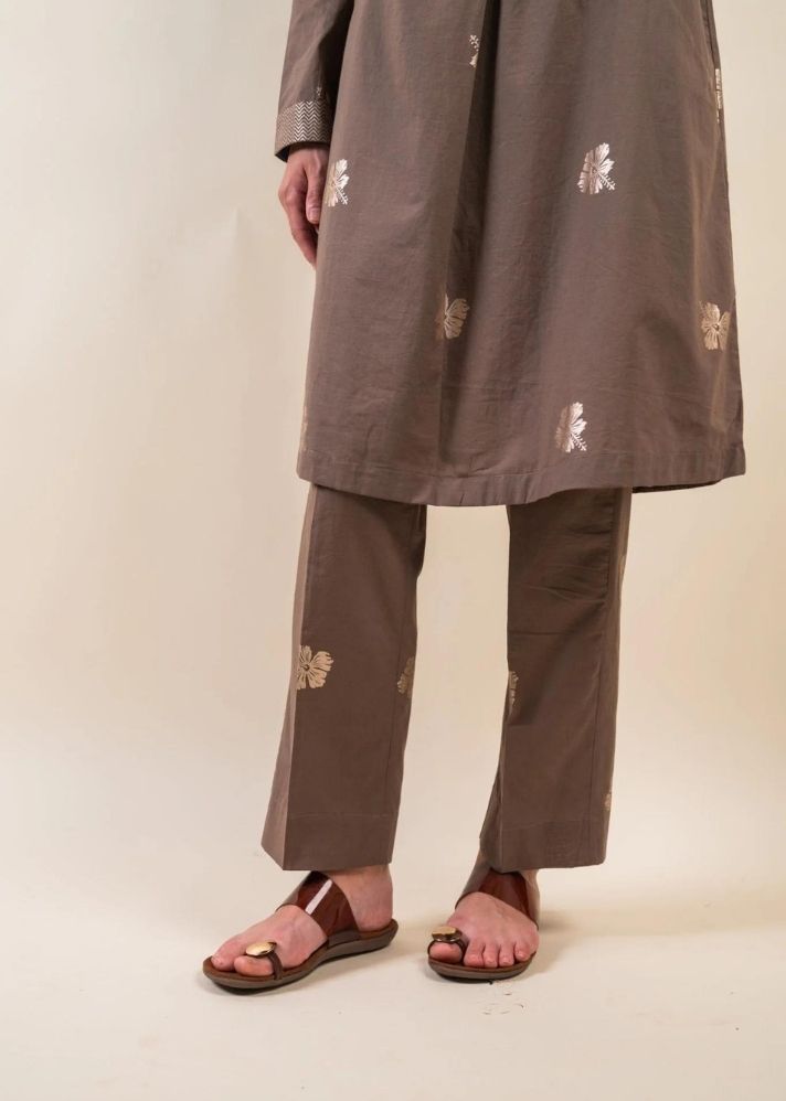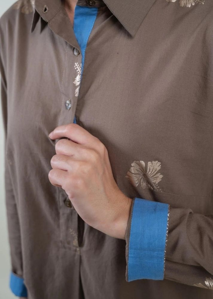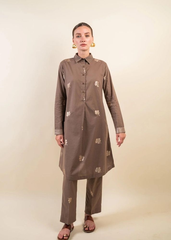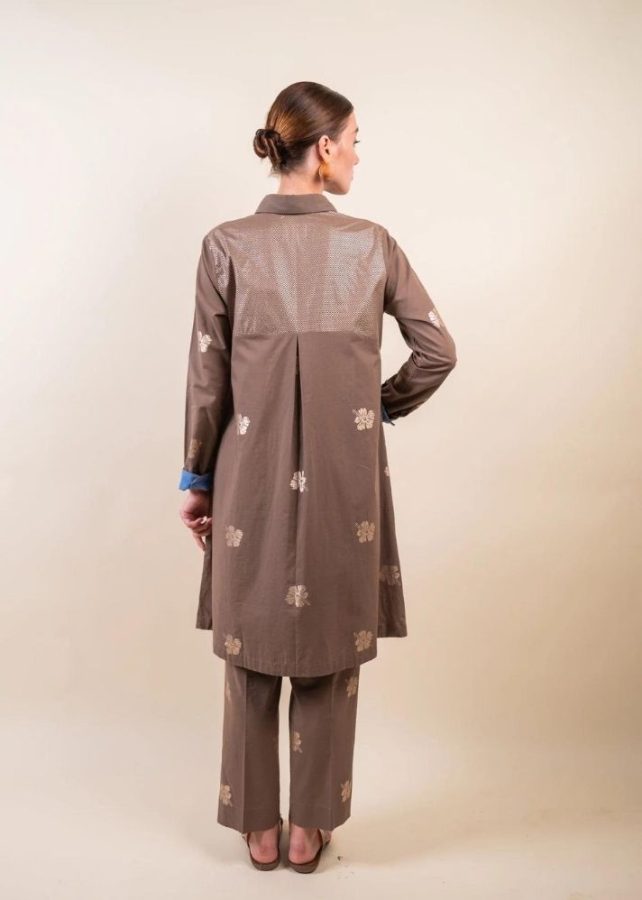 أضف البهجة إلى خزانة ملابسك الاحتفالية مع مجموعة Nalini Co-ord. هذه المجموعة باللون الرمادي الداكن، مطبوعة بطباعة رقائق الكركديه والشيفرون. ياقة مدببة، وفتحة وأكمام بأساور تعطي انطباعًا!