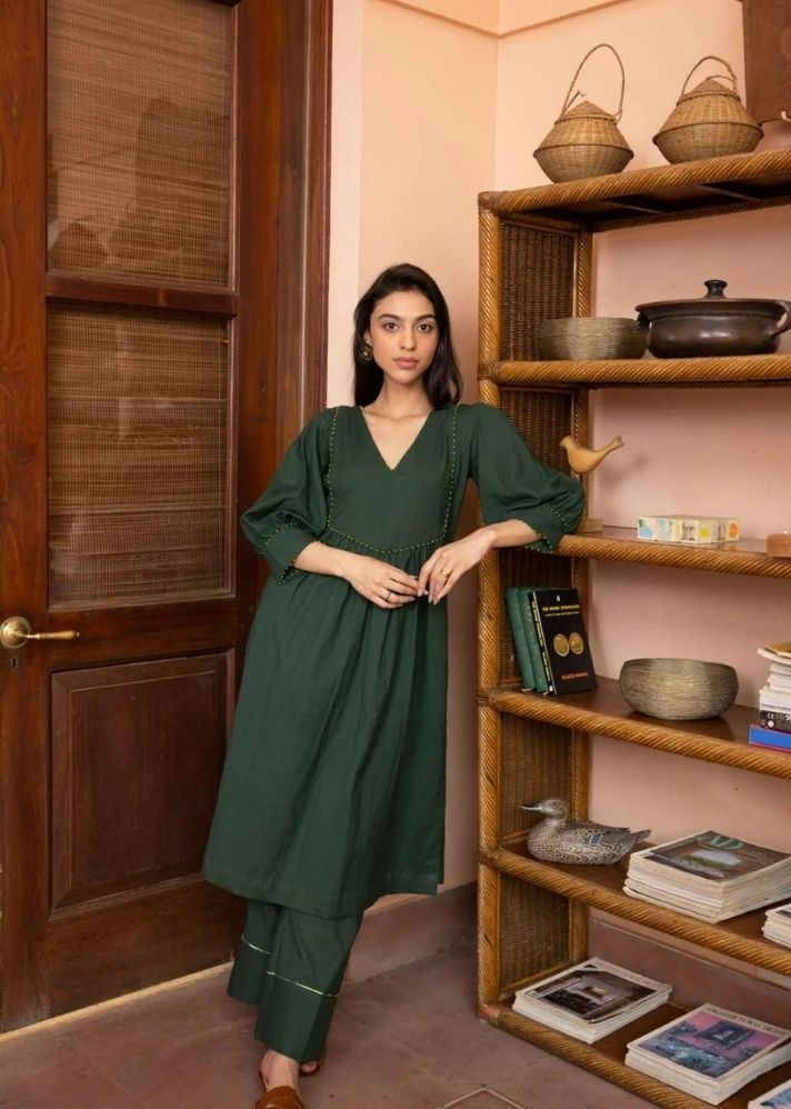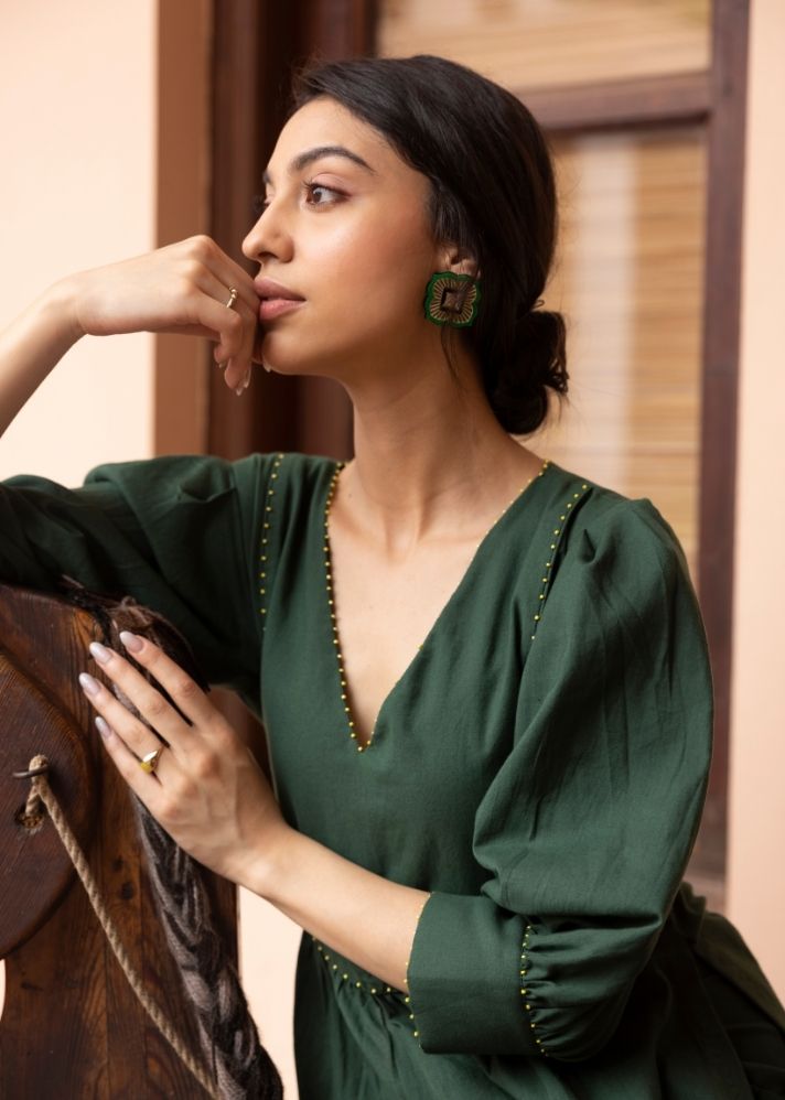 "ادخل إلى عالم من السحر مع كورتا الأناقة الخاصة بنا باللون الأخضر القطني العضوي. تتألق كل تفاصيل معقدة بأناقة، وتضيف لمسة من البريق إلى التصميم التقليدي. وتتناقض الخرزة الزجاجية مع تفاصيل حول الرقبة والنير، مما يضيف لمسة رقيقة إلى كورتا بأكمام بالون ثقيلة وتفاصيل فتحة عالية، مما يجعلها إضافة رائعة لخزانة ملابسك التقليدية. تم تصنيع هذا المنتج بواسطة ارتيسان مونو"