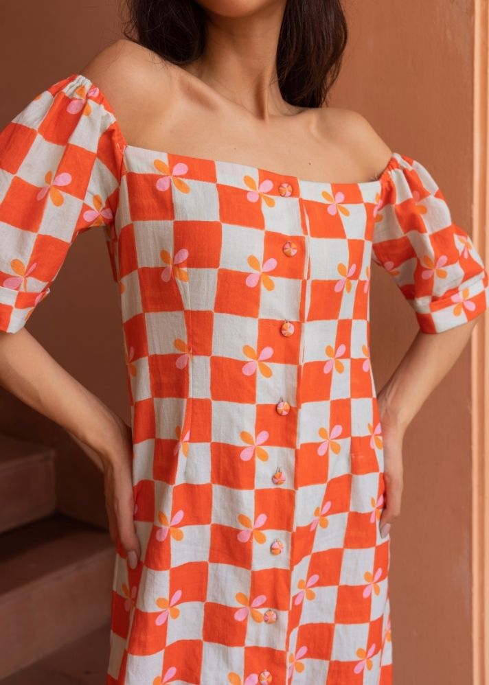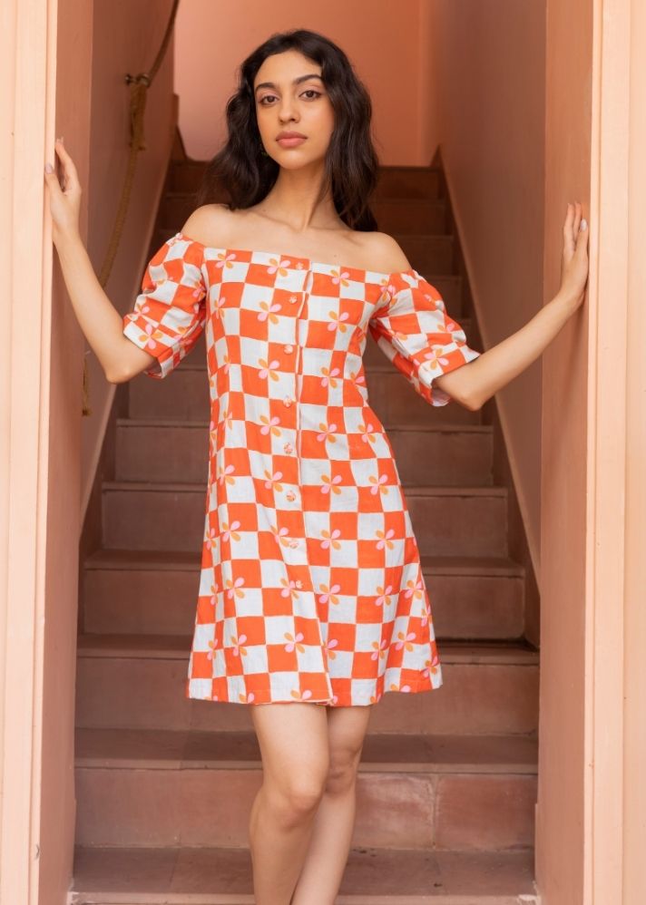 "على الرغم من رقة الأمر، فإن فستان الأوسكار الخاص بنا المصنوع من قطن ORGANIC PEACH CHECKS، هو المكان الذي تلتقي فيه الرقبة المربعة بجاذبية الأكتاف المكشوفة. مع الأكمام التي تحيط بالكتفين برشاقة، يجسد هذا الفستان الأناقة والسحر. مثالي لأي إجازة، ارتقي بأسلوبك مع هذا المزيج من التصميم المعاصر والنعمة الخالدة، مما يخلق مجموعة مذهلة وجذابة. تم تصنيع هذا المنتج بواسطة ارتيسان راهول"