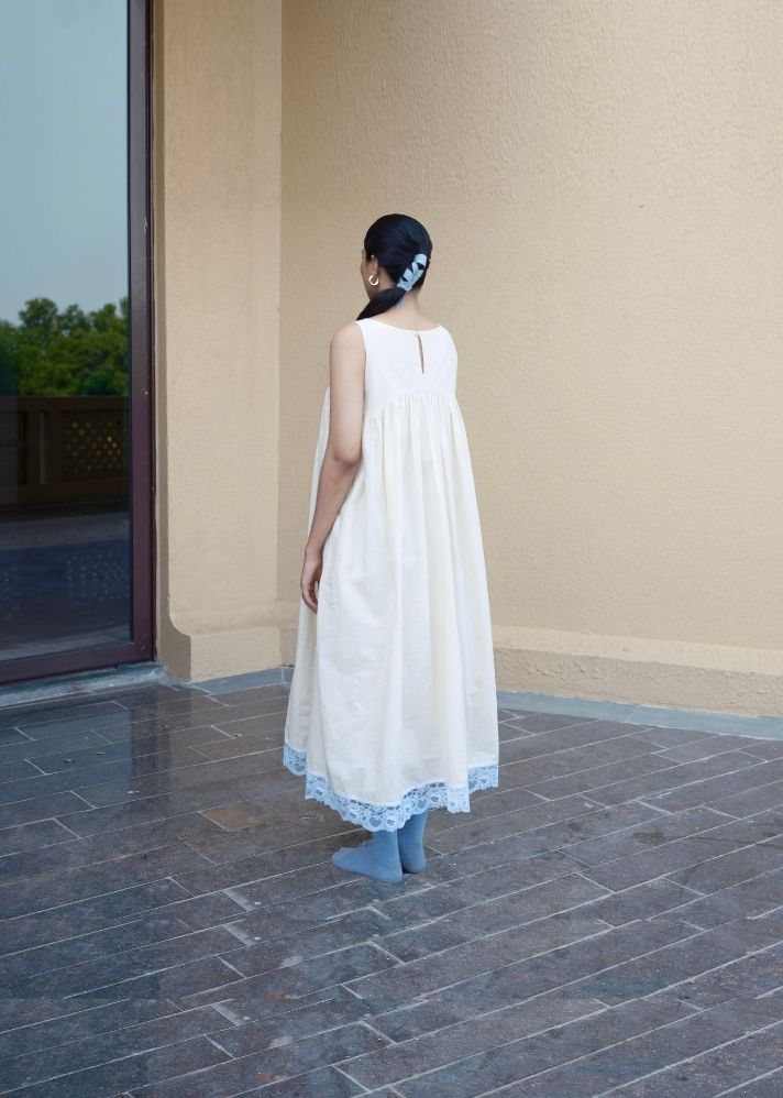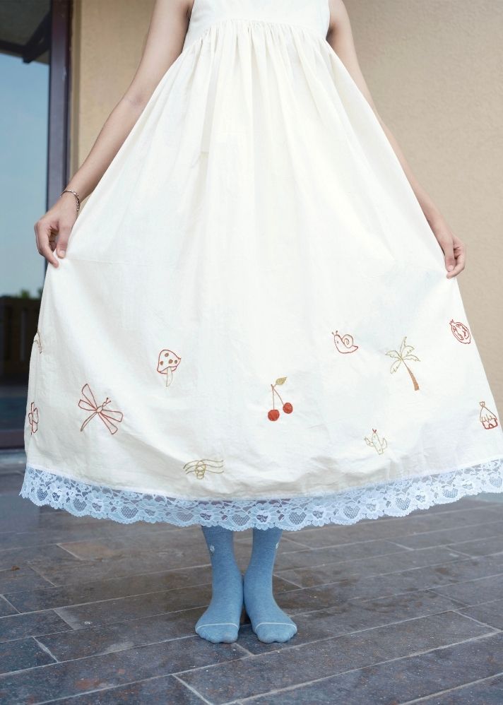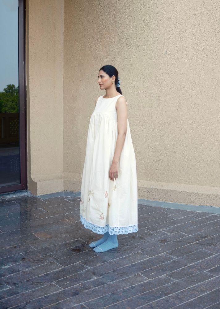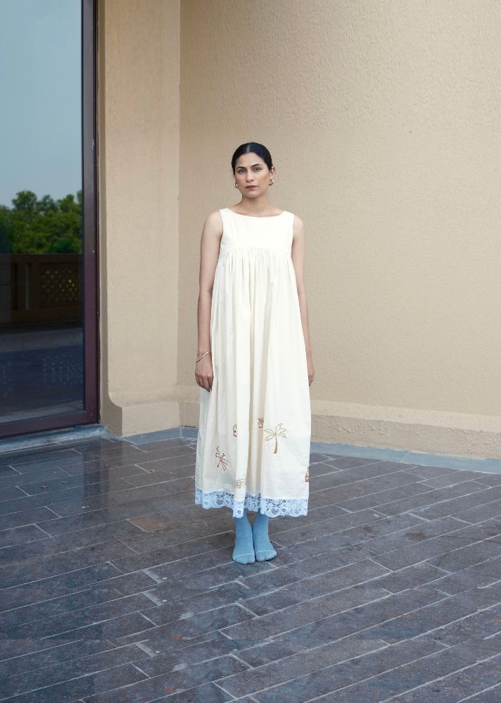 الفستان الصيفي الأكثر متعة، مع رقبة على شكل قارب وصورة ظلية واسعة. كما أنها مزينة بزخارف مطرزة يدوياً ممتعة بظلال الأرض.