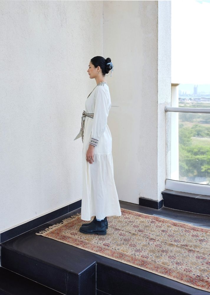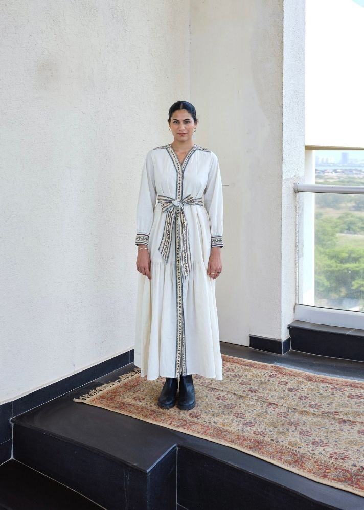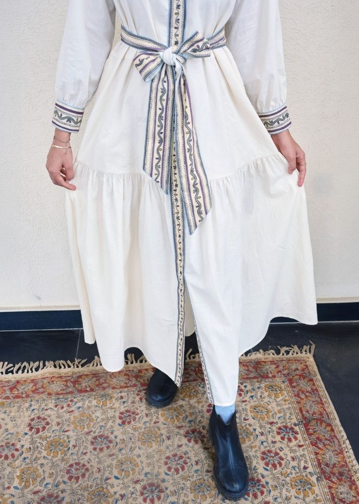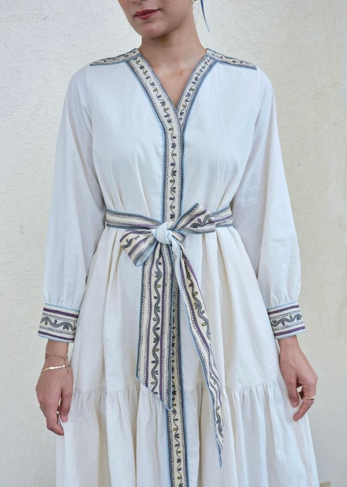 أضيفي لمسة منعشة من الألوان إلى خزانة ملابسك مع هذا الفستان الذي يتميز بحواف متباينة ورسومات يدوية، ارتديه مع الحزام أو بدونه لسهولة الانتقال من الفستان الملائم إلى الفستان المتدفق.