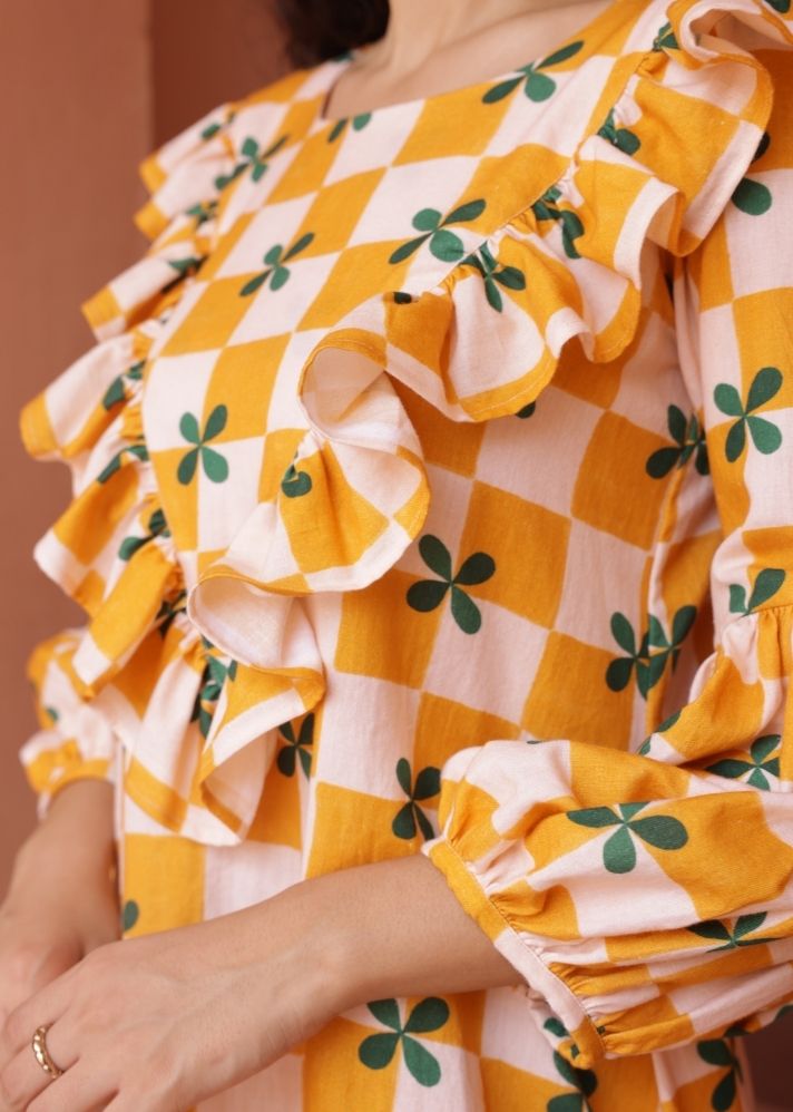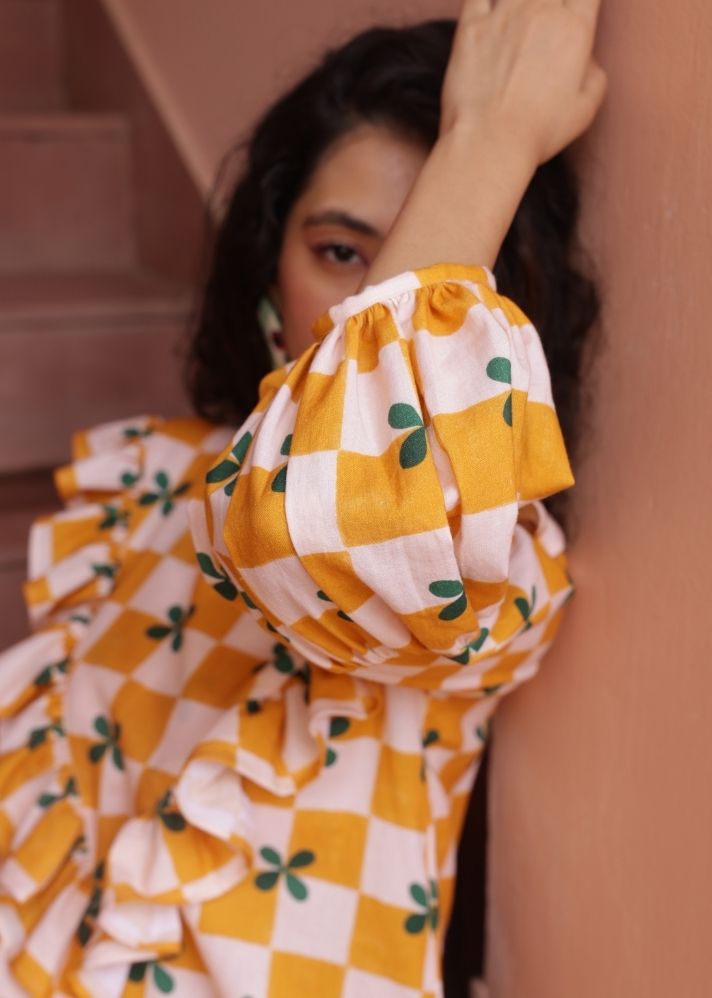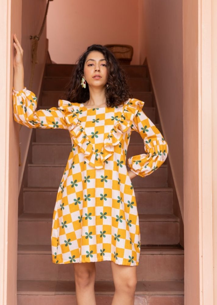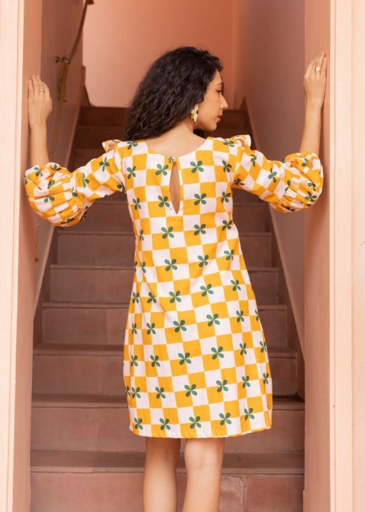 "تمامًا كما يوحي الاسم، فإن فستاننا الغريب المصنوع من القطن العضوي بنقشات الخردل يجسد سحرًا غير رسمي دون عناء، فطوله القصير وقصته الكلاسيكية على شكل حرف A، يوفر الراحة والأناقة في آن واحد. تفاصيل الكشكشة حول الرقبة وتفاصيل الأكمام البالونية الدقيقة يضيف لمسة من المرح إلى خزانة ملابسك. هذا المنتج من صنع الحرفي وسيم"