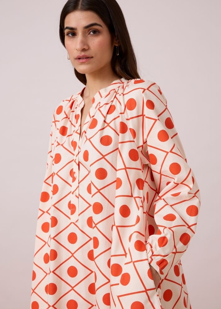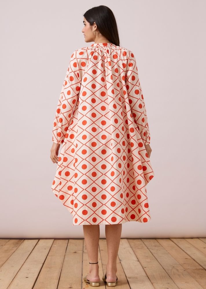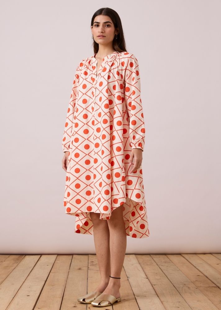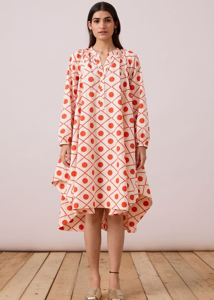 فستان على شكل حرف A . ياقة بشريط مسطح مع فتحة أزرار جزئية. كشكشة دقيقة حول الياقة والأكفة. جيوب داخلية.