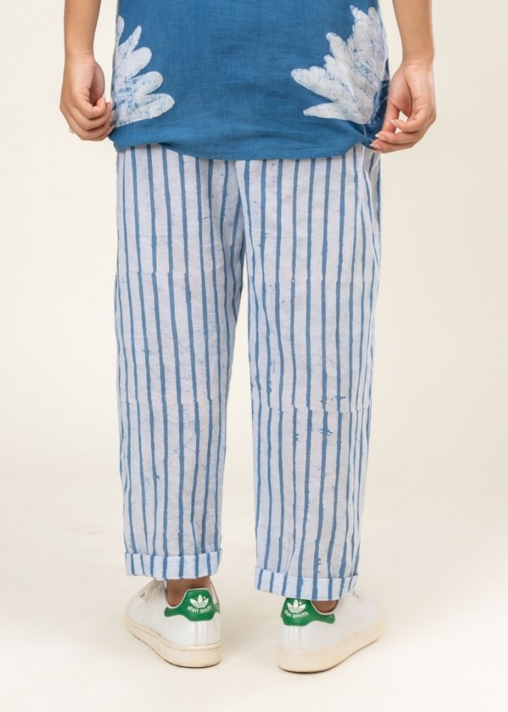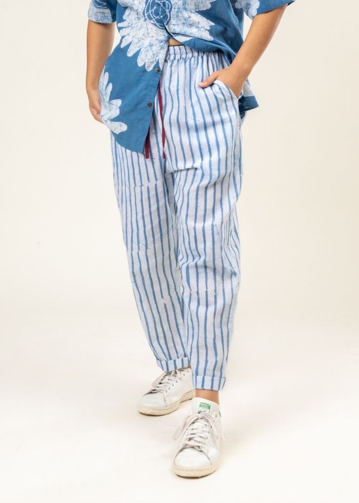 "بنطلون مطاطي مخطط من الباتيك. الموضوع: يتم الحصول على البوليستر من كميات مختلطة من بقايا المصانع الأزرار: أزرار قشرة جوز الهند قابلة للتحلل البيولوجي بنسبة 100% صُنع الباتيك في الهند لهذه القمصان يدويًا على يد حرفيين في قرية بالقرب من بهوج، غوجارات. إن العمل مع الحرفيين المحليين يمكننا من تحقيق اللامركزية في سلسلة التوريد الخاصة بنا، مما يوفر للحرفيين الفرصة لعيش حياة أكثر صحة في مجتمعاتهم الخاصة. يتم بعد ذلك تحويل القماش المصبوغ مسبقًا إلى مصنع بأجور عادلة في دلهي. تعمل منشأة الإنتاج المتخصصة صغيرة الحجم هذه على تقليل كمية النفايات الناتجة، وإعادة استخدام أي قصاصات من المواد للنسيج المرقعة. قد يتميز كل عنصر بتطريز إضافي أو رقعة لتحسين استخدام بقايا القماش، لكنه لا يزال يعرض نفس الشكل والملمس واللمسة النهائية. أشعر بالفخر بارتداء هذه القطعة الفريدة والمميزة."