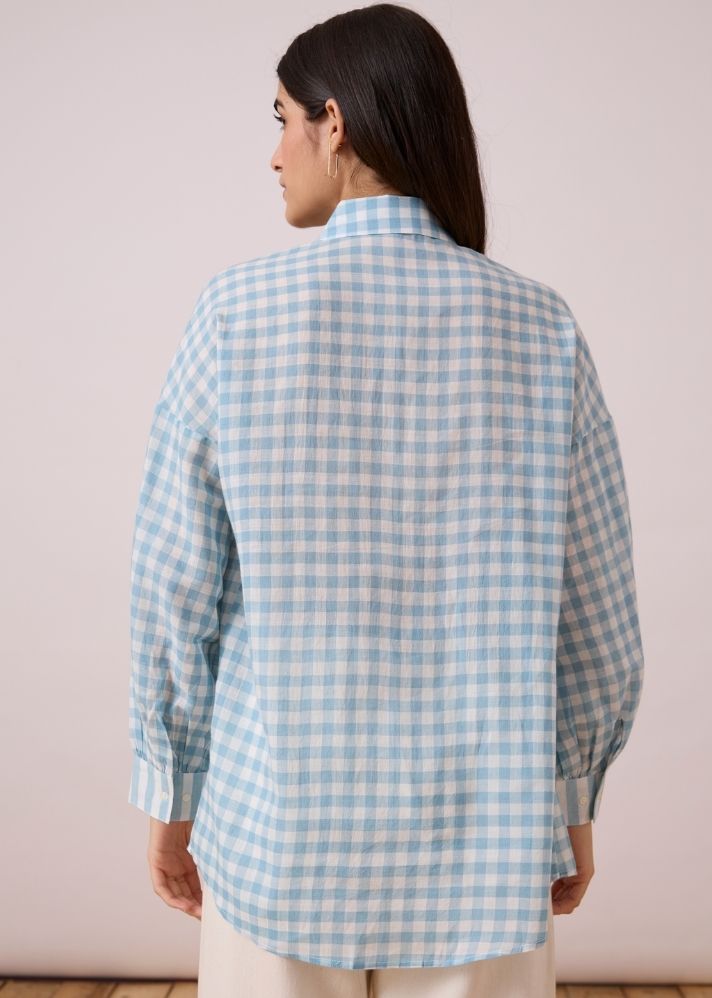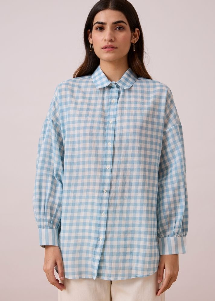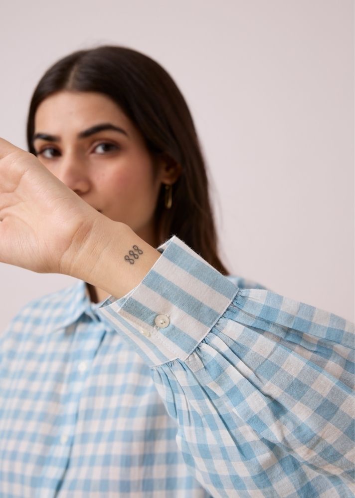 قطن منسوج يدويًا. قميص مريح بياقة رفيعة. فتحة أمامية مزودة بزر للإغلاق. كتف منسدل وأكمام أسقف. كتف منحني قليلاً.