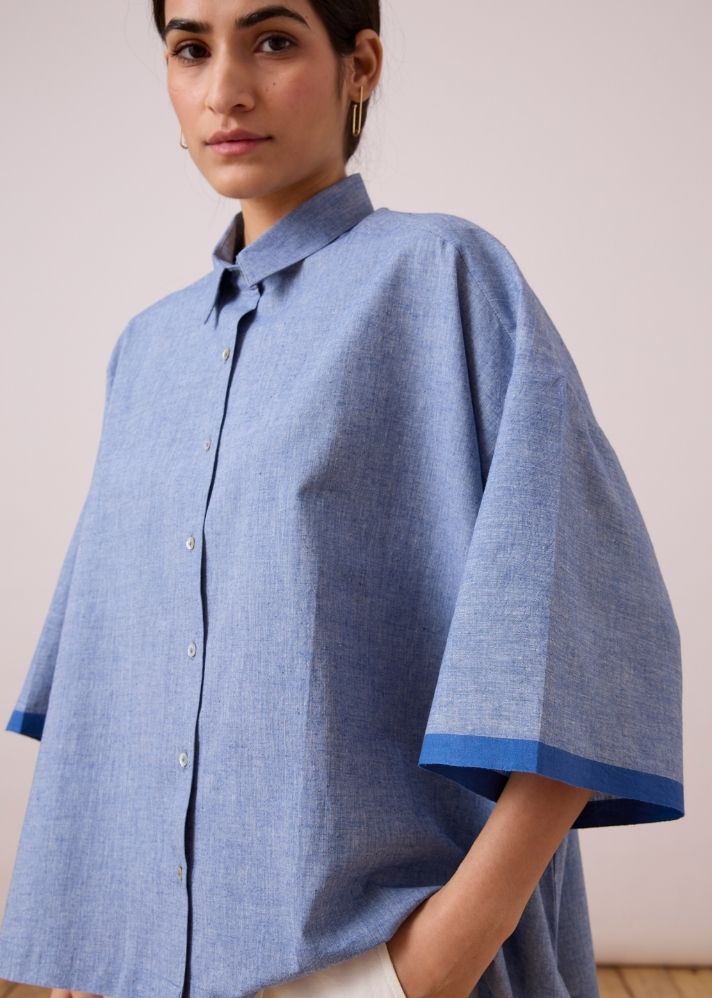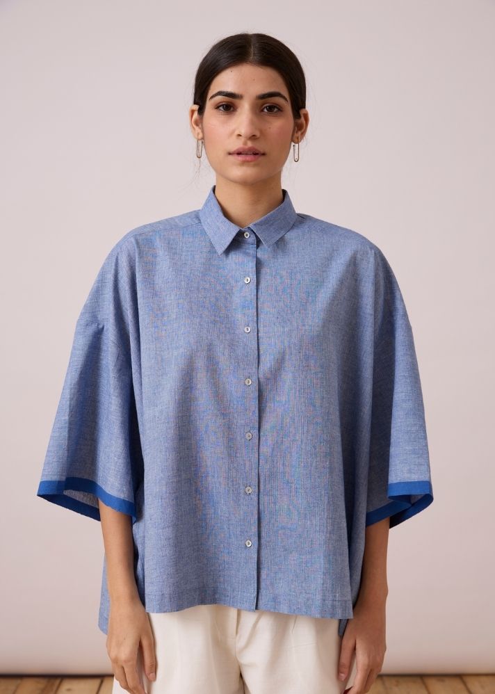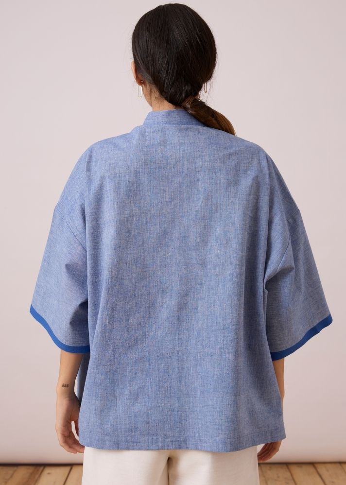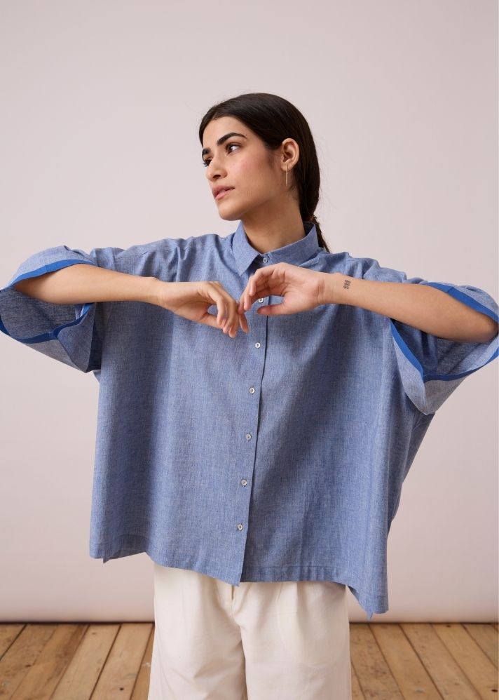 قميص بقصة مربعة من القطن المنسوج يدويًا. الظهر معلق أطول قليلاً من الأمام. إبزيم الزر. تم تشطيبه بتفاصيل الدنيم على الكم.