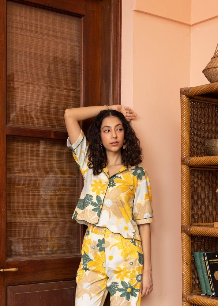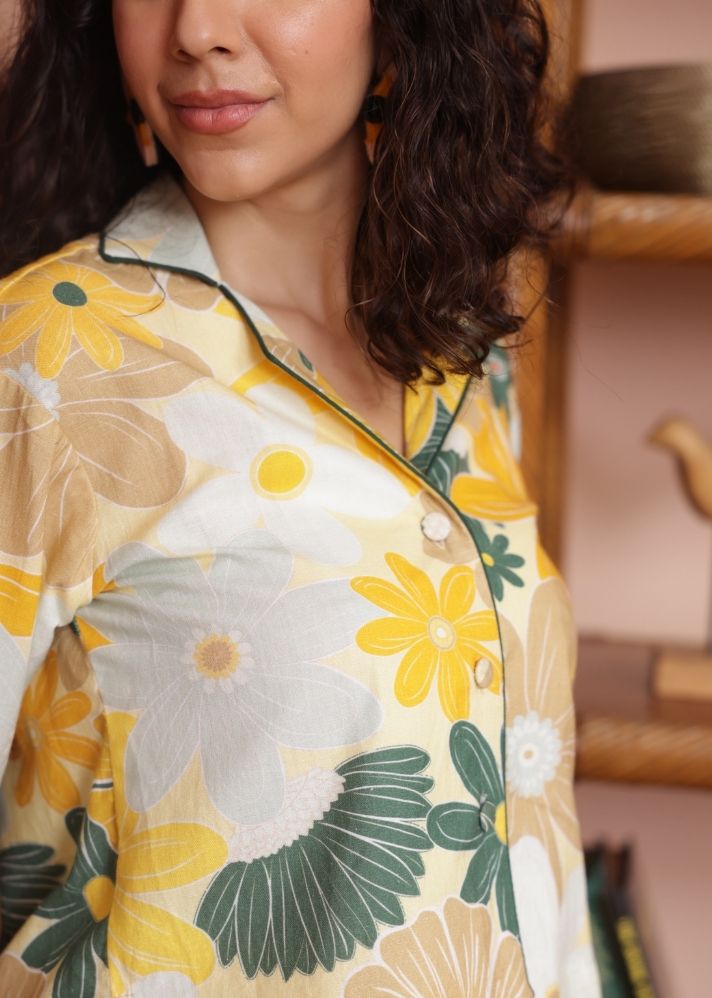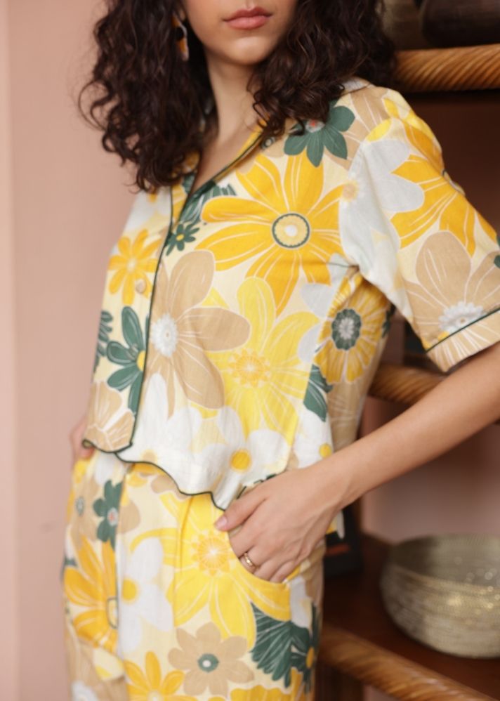 "مزيج من جرأة الصيف وجاذبية الخريف، قميص مطبوع باللون الأصفر من القطن العضوي الفسيفسائي. يتميز بتصميم مريح مع ياقة طية صدر مدببة وتفاصيل مموجة على حاشيةه جنبًا إلى جنب مع طباعة مصممة لأولئك الذين يعشقون الشمس إلى الأبد وعلى استعداد للتألق في كل مكان. تم تصنيع هذا المنتج بواسطة ارتيسان مونو"