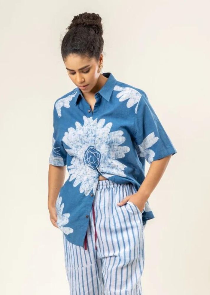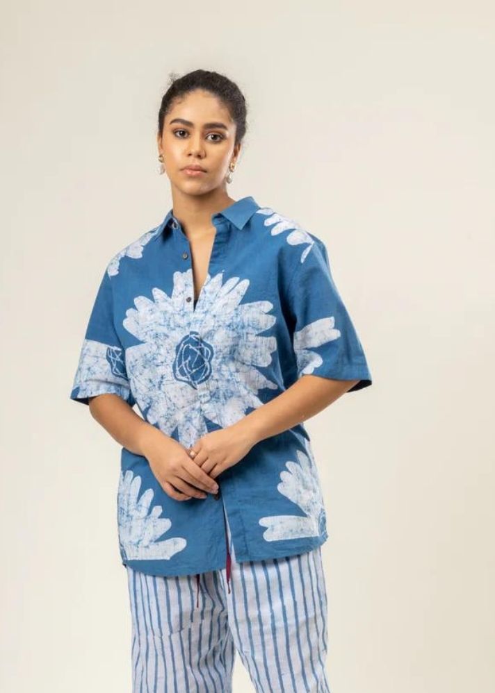 "قميص الباتيك الزهري. الخيط - يتم الحصول على البوليستر من كميات مختلطة من بقايا المصنع الأزرار - أزرار قشرة جوز الهند قابلة للتحلل البيولوجي بنسبة 100% صُنع الباتيك في الهند لهذه القمصان يدويًا على يد حرفيين في قرية بالقرب من بهوج، غوجارات. إن العمل مع الحرفيين المحليين يمكننا من تحقيق اللامركزية في سلسلة التوريد الخاصة بنا، مما يوفر للحرفيين الفرصة لعيش حياة أكثر صحة في مجتمعاتهم الخاصة. يتم بعد ذلك تحويل القماش المصبوغ مسبقًا إلى مصنع بأجور عادلة في دلهي. تعمل منشأة الإنتاج المتخصصة صغيرة الحجم هذه على تقليل كمية النفايات الناتجة، وإعادة استخدام أي قصاصات من المواد للنسيج المرقعة. قد يتميز كل عنصر بتطريز إضافي أو رقعة لتحسين استخدام بقايا القماش، لكنه لا يزال يعرض نفس الشكل والملمس واللمسة النهائية. أشعر بالفخر بارتداء هذه القطعة الفريدة والمميزة."