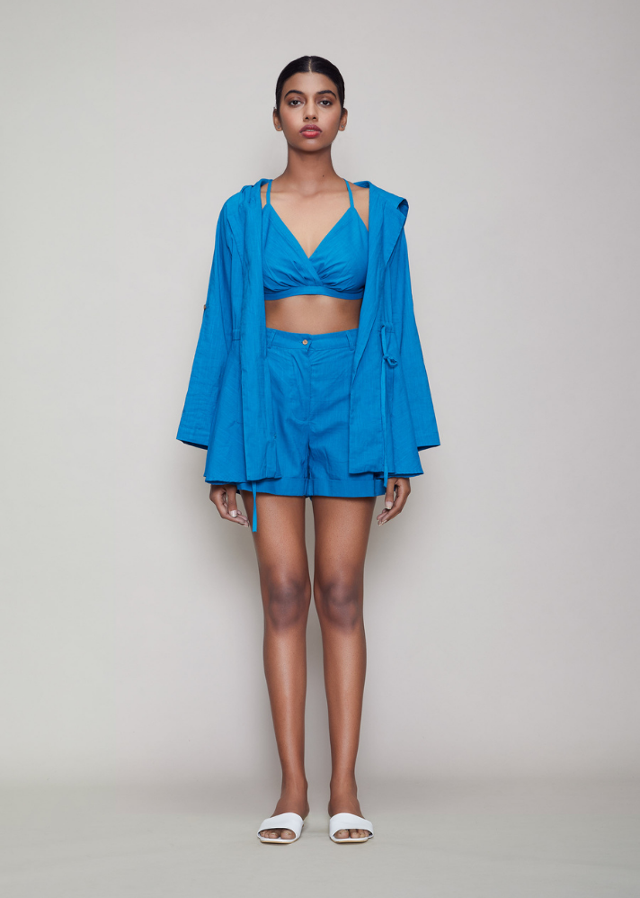 طقم من 3 قطع جاكيت بغطاء للرأس وسروال قصير باللون الأزرق