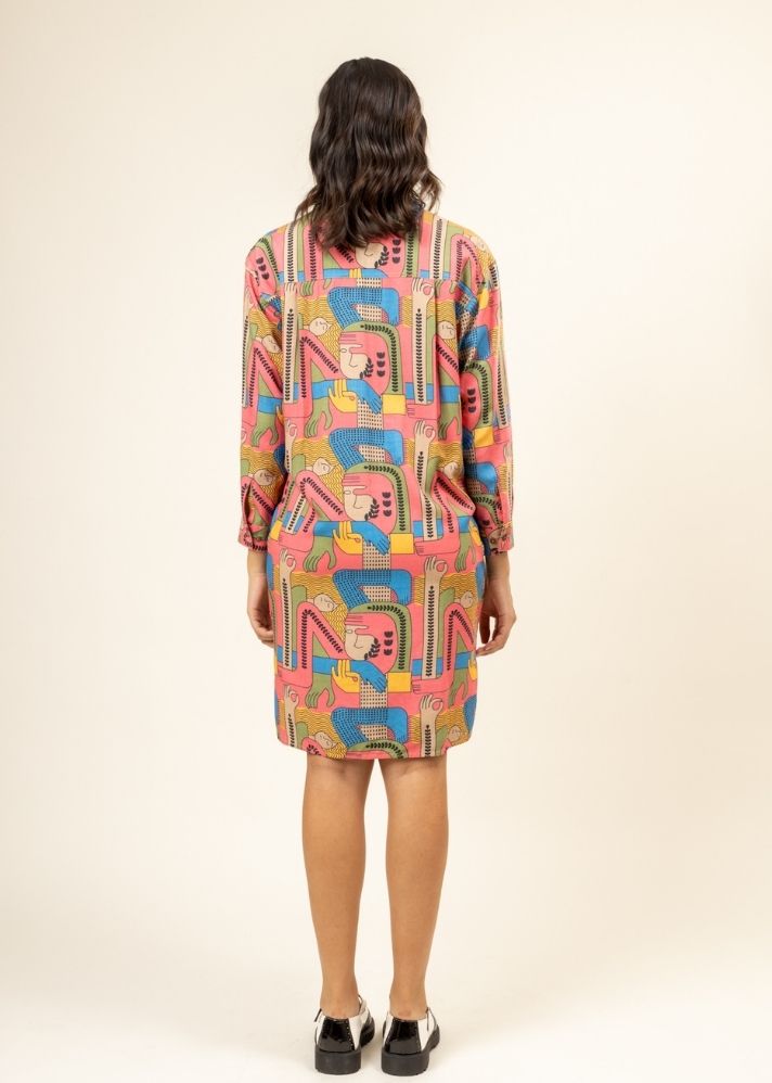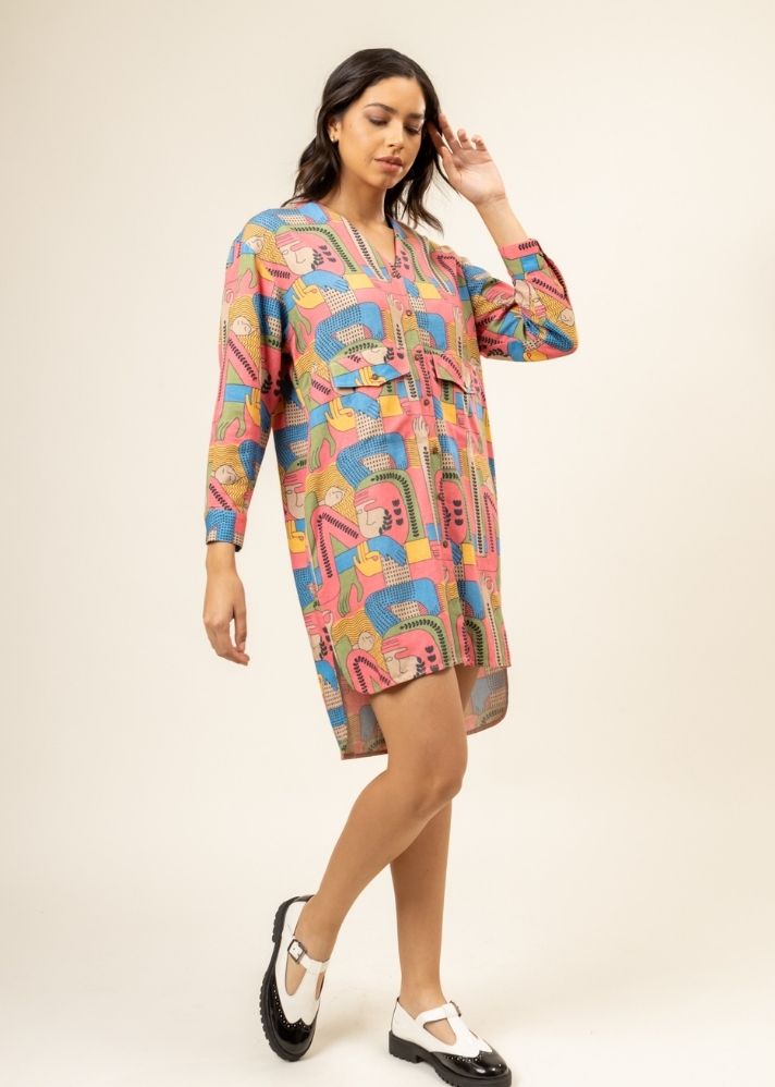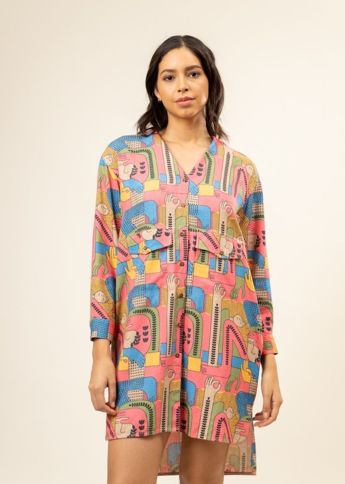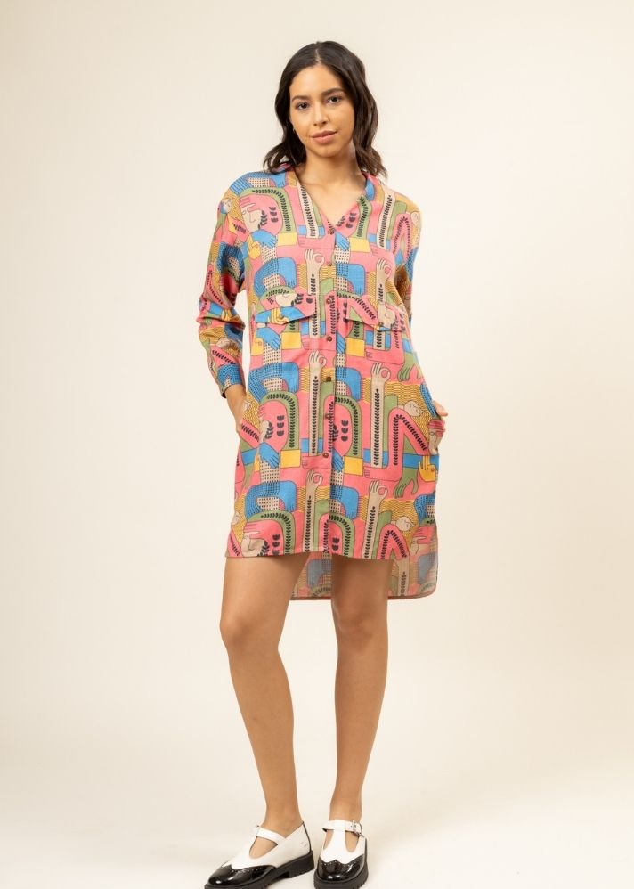 "فستان قميص واسع بأكمام كاملة مع فتحة جانبية صغيرة وياقة الجيب: 2 جيب بغطاء قلاب و2 جيب جانبي. صنع في الهند: هذا المنتج مصنوع في دلهي من خلال مصنع بأجور عادلة. المصنع متخصص في الإنتاج على نطاق صغير، حيث يمكننا تقليل توليد النفايات وإدارة نفايات المصنع عن طريق إعادة تدوير الخردة إلى نسيج مرقع. قد تأتي كل قطعة مع تطريز أو رقعة إضافية ولكن الشكل والمظهر العام للقطعة لا يتغير. "