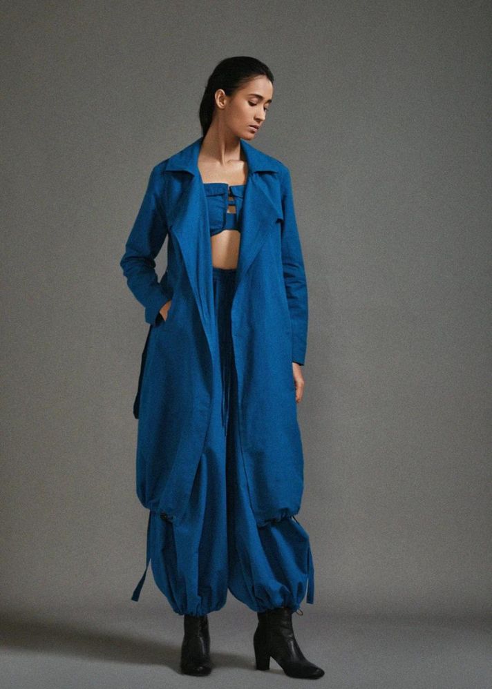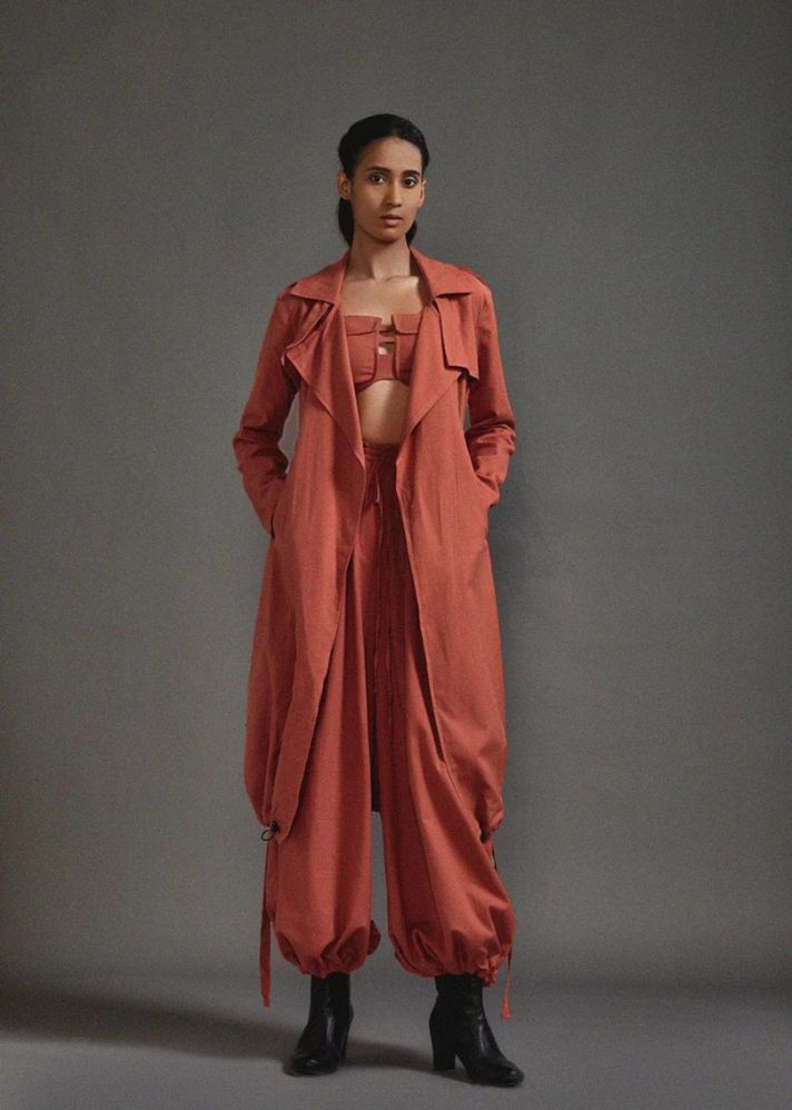 جاكيت ترنش كبير الحجم بحاشية مطاطية وجيوب جانبية وحزام من القماش. ارتديه مع مشد وحمالة صدر من مجموعتنا.