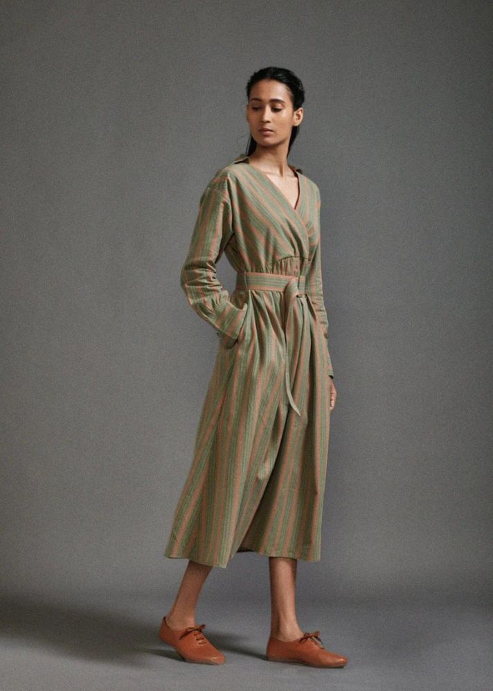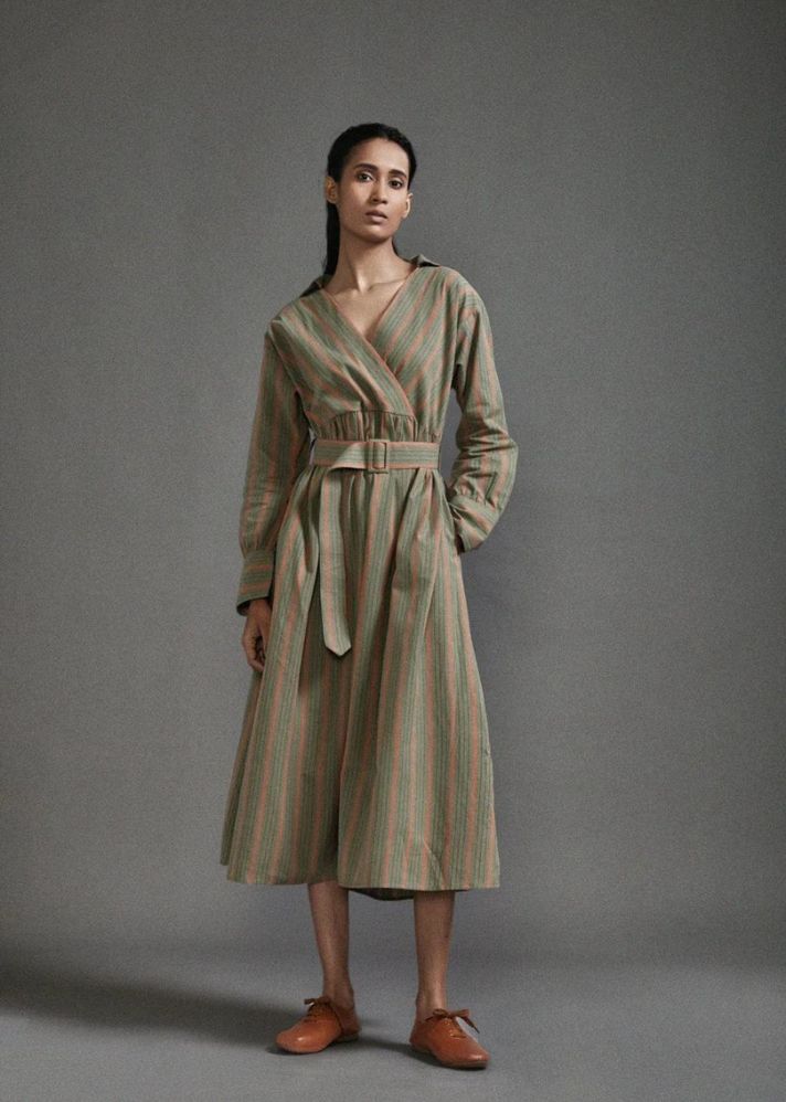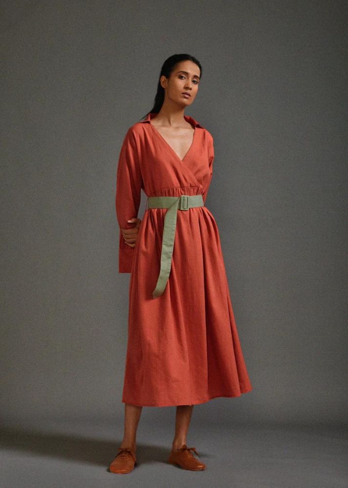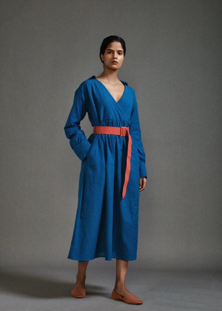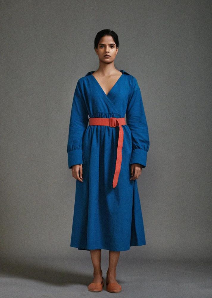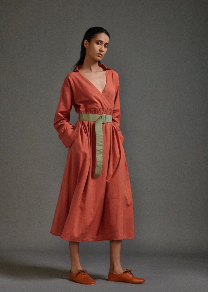 فستان مصنوع من القطن المنسوج يدوياً والذي يتداخل من الأمام ويأتي مع حزام بلون متباين.