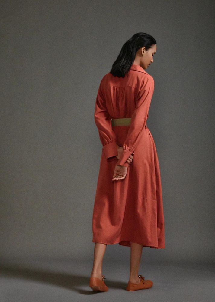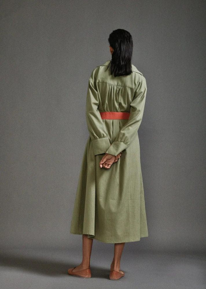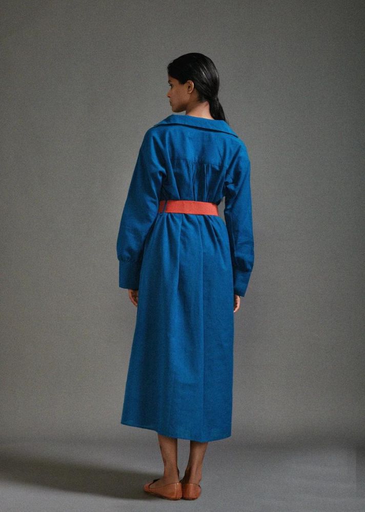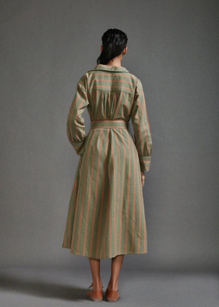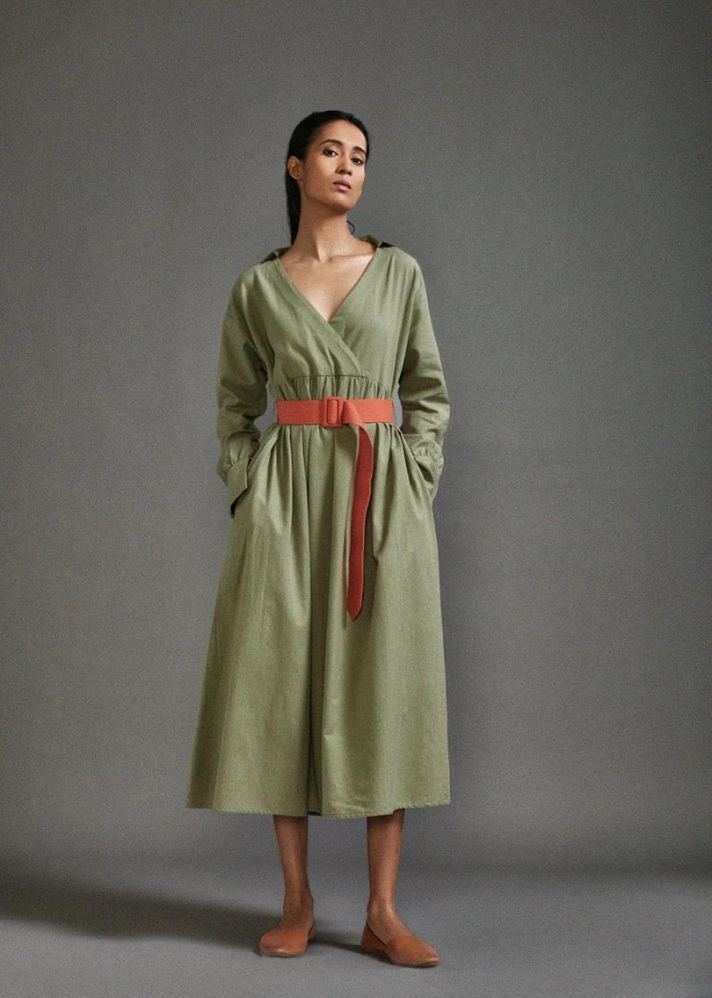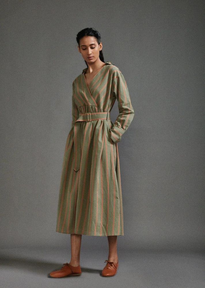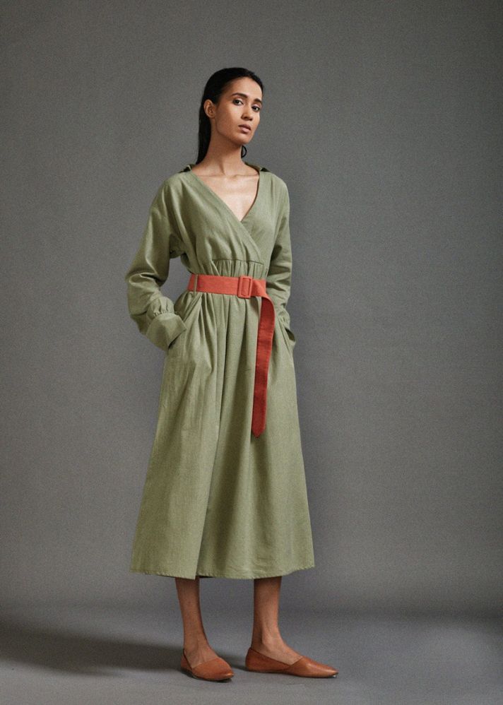 فستان مصنوع من القطن المنسوج يدوياً والذي يتداخل من الأمام ويأتي مع حزام بلون متباين.