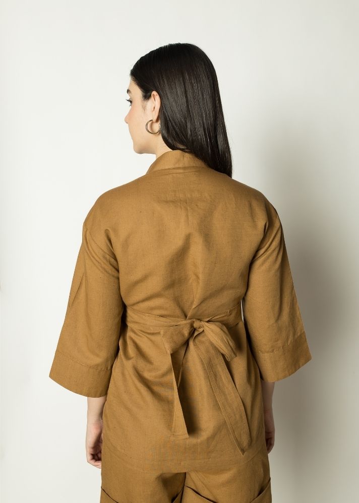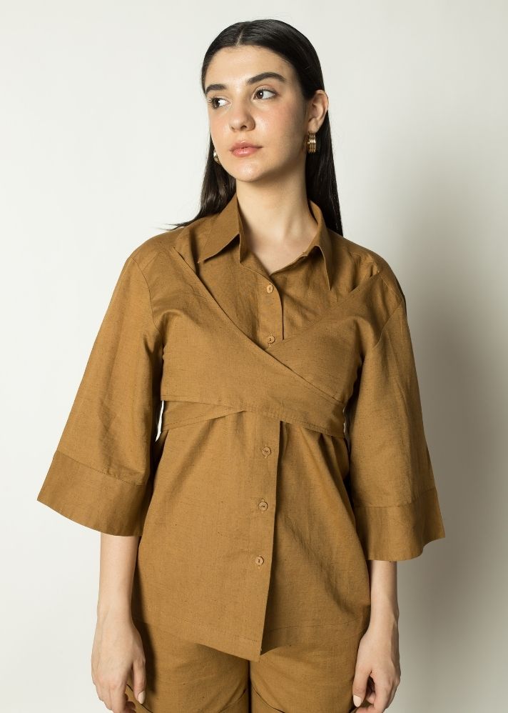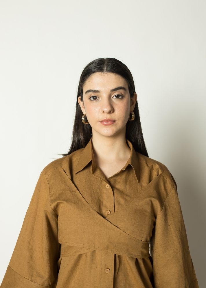 يتناقض هذا القميص بشكل دقيق مع القطع الأكثر تفصيلاً في هذه المجموعة. تحتوي على أكتاف منسدلة مع طبقة خارجية يمكن ربطها من الخلف مما يعطي وهمًا بالطبقات. تم تصميمه بأكمام واسعة بطول 3/4 وأساور عريضة.