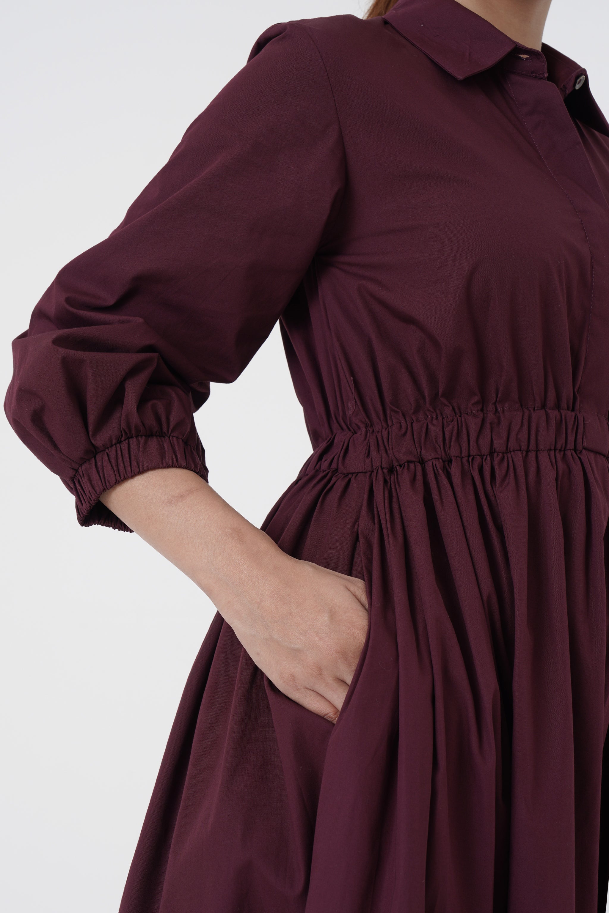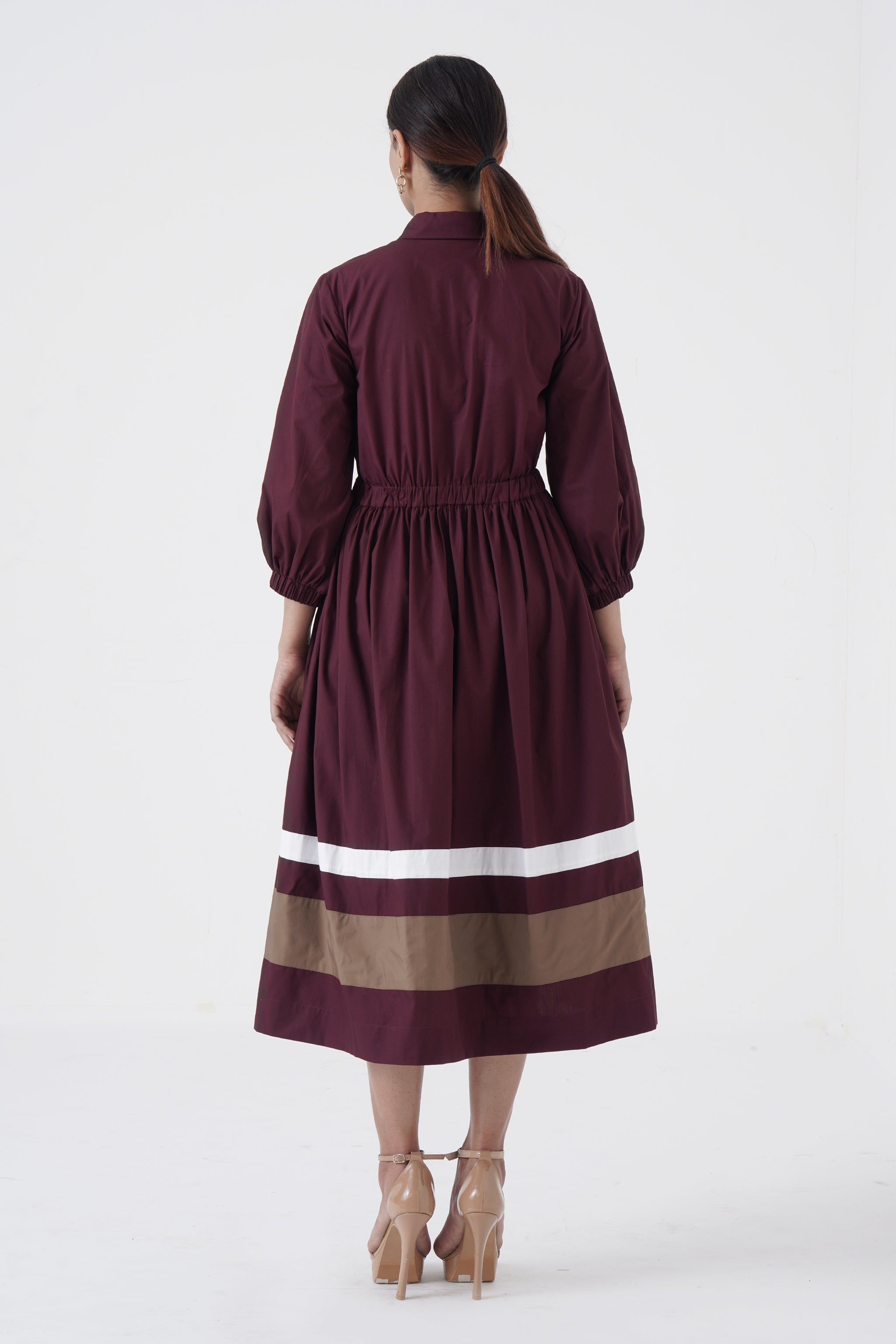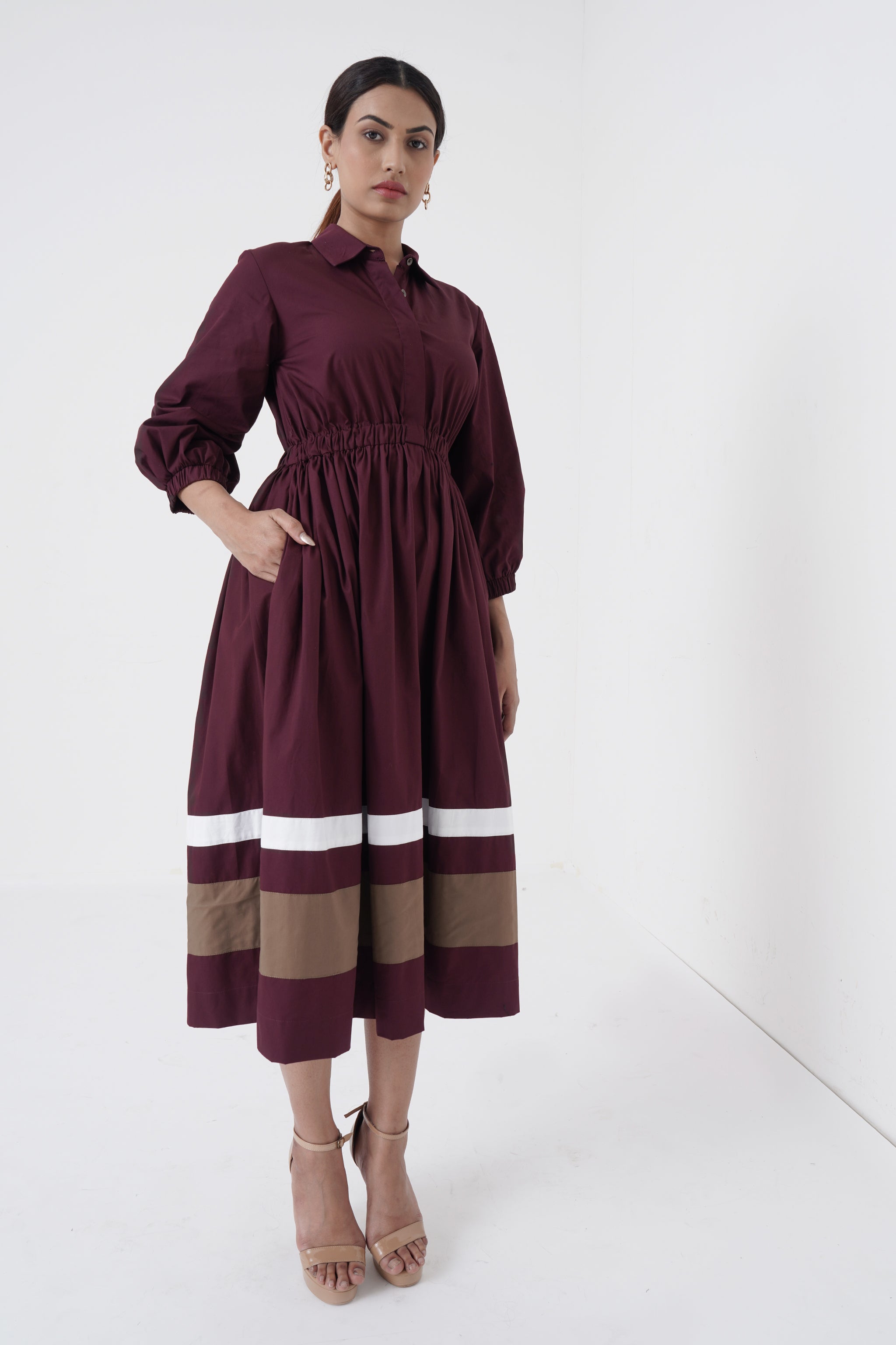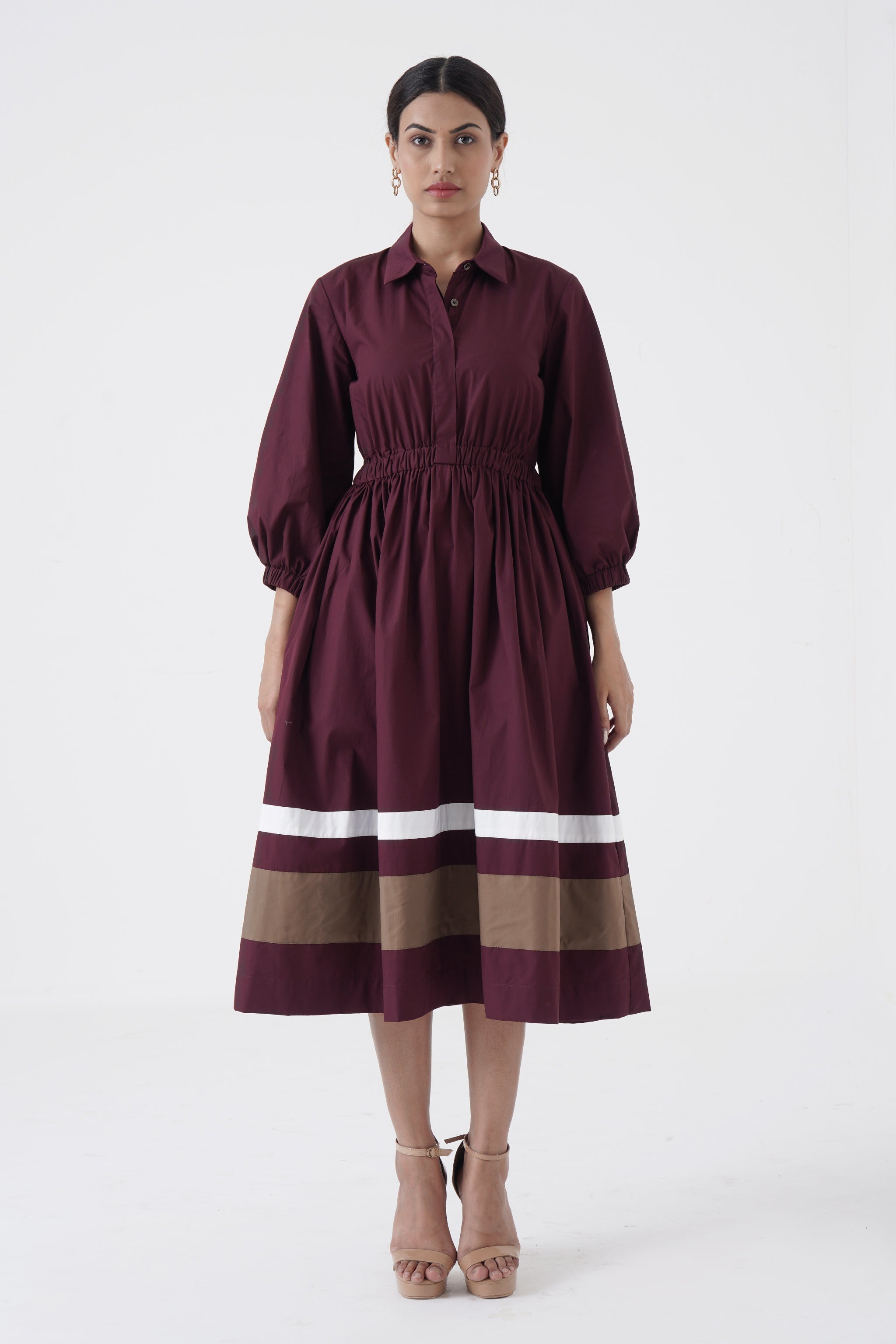 كوشير- فستان طويل بياقة قميص، وزم على الخصر، مخطط بشرائط بألوان مغايرة من الأسفل - نبيتي