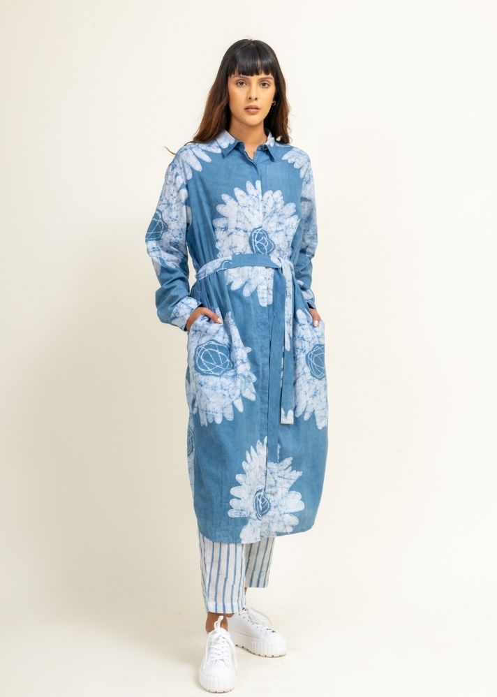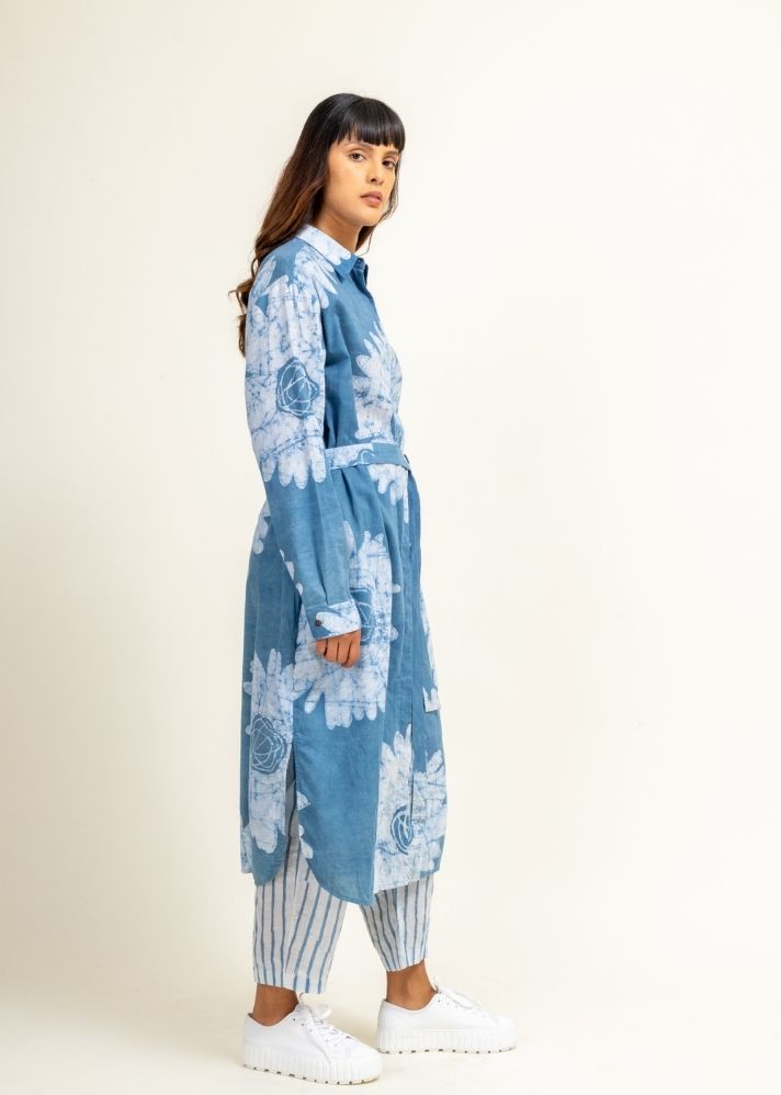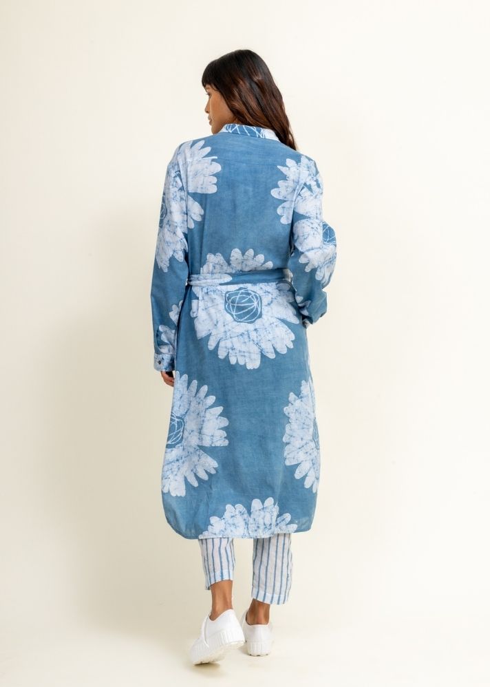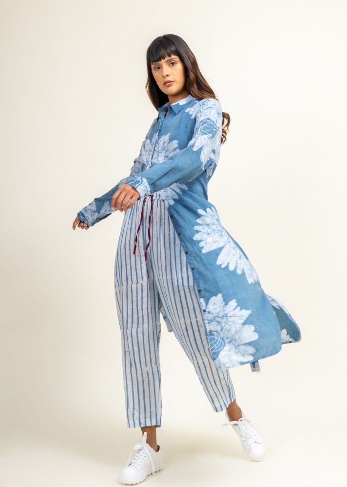 سترة باتيك زهرية مع فتحة أمامية وحاشية منحنية. كان للسترة فتحات وتأتي مع حزام وجيوب جانبية. بنطال باتيك مطاطي مخطط